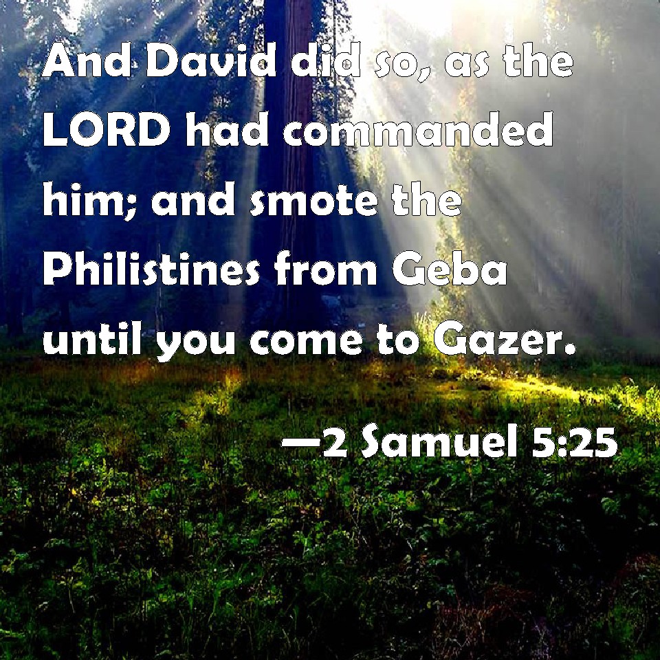 2 Samuel 5:25 And David did so, as the LORD had commanded him; and smote the Philistines from Geba until you come to Gazer.