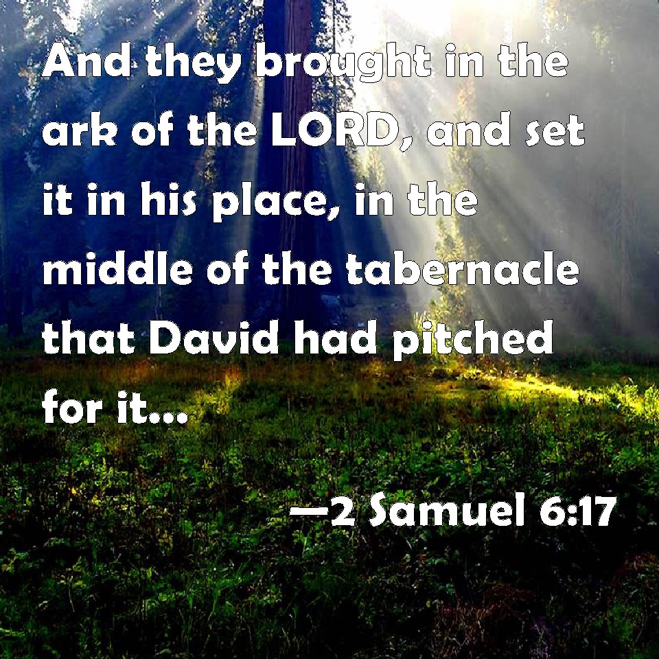 Choose a Background 2 Samuel 6:17 And they brought in the ark of the LORD, and set it in his place, in the middle of the tabernacle that David had pitched for it: and David offered burnt offerings and peace offerings before the LORD. KJV: And they brought in the ark of the LORD, and set it in his place, in the midst of the tabernacle that David had pitched for it: and David offered burnt offerings and peace offerings before the LORD. DRB: And they brought the ark of the Lord, and set it in its place in the midst of the tabernacle, which David had pitched for it: and David offered holocausts, and peace offerings before the Lord. DBT: And they brought in the ark of Jehovah, and set it in its place, in the midst of the tent that David had spread for it. And David offered up burnt-offerings and peace-offerings before Jehovah. ERV: And they brought in the ark of the LORD, and set it in its place, in the midst of the tent that David had pitched for it: and David offered burnt offerings and peace offerings before the LORD. WBT: And they brought in the ark of the LORD, and set it in its place, in the midst of the tabernacle that David had pitched for it: and David offered burnt-offerings and peace-offerings before the LORD. WEB: They brought in the ark of Yahweh, and set it in its place, in the midst of the tent that David had pitched for it; and David offered burnt offerings and peace offerings before Yahweh. YLT: And they bring in the ark of Jehovah, and set it up in its place, in the midst of the tent which David hath spread out for it, and David causeth to ascend burnt-offerings before Jehovah, and peace-offerings.Links 2 Samuel 6:17 NIV • 2 Samuel 6:17 NLT • 2 Samuel 6:17 ESV • 2 Samuel 6:17 NASB • 2 Samuel 6:17 KJV • 2 Samuel 6:17 Interlinear • 2 Samuel 6:17 Commentaries • 2 Samuel 6:17 Parallel Texts • 2 Samuel 6:17 Bible Apps • 2 Samuel 6:17 Parallel • Bible Hub |