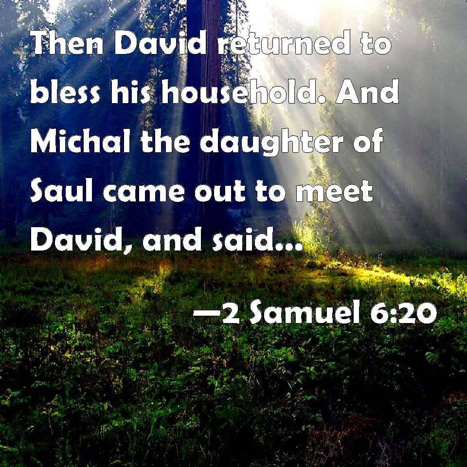 Choose a Background 2 Samuel 6:20 Then David returned to bless his household. And Michal the daughter of Saul came out to meet David, and said, How glorious was the king of Israel to day, who uncovered himself to day in the eyes of the handmaids of his servants, as one of the vain fellows shamelessly uncovers himself! KJV: Then David returned to bless his household. And Michal the daughter of Saul came out to meet David, and said, How glorious was the king of Israel to day, who uncovered himself to day in the eyes of the handmaids of his servants, as one of the vain fellows shamelessly uncovereth himself! DRB: And David returned to bless his own house: and Michol the daughter of Saul coming out to meet David, said: How glorious was the king of Israel to day, uncovering himself before the handmaids of his servants, and was naked, as if one of the buffoons should be naked. DBT: And David returned to bless his household. And Michal the daughter of Saul came out to meet David, and said, How honourable did the king of Israel make himself to-day, who uncovered himself to-day in the eyes of the handmaids of his servants, as one of the lewd fellows shamelessly uncovers himself! ERV: Then David returned to bless his household. And Michal the daughter of Saul came out to meet David, and said, How glorious was the king of Israel today, who uncovered himself today in the eyes of the handmaids of his servants, as one of the vain fellows shamelessly uncovereth himself! WBT: Then David returned to bless his household. And Michal the daughter of Saul came out to meet David, and said, How glorious was the king of Israel to-day, who uncovered himself to-day in the eyes of the handmaids of his servants, as one of the vain fellows shamelessly uncovereth himself! WEB: Then David returned to bless his household. Michal the daughter of Saul came out to meet David, and said, "How glorious the king of Israel was today, who uncovered himself today in the eyes of the handmaids of his servants, as one of the vain fellows shamelessly uncovers himself!" YLT: And David turneth back to bless his house, and Michal daughter of Saul goeth out to meet David, and saith, 'How honourable to-day was the king of Israel, who was uncovered to-day before the eyes of the handmaids of his servants, as one of the vain ones is openly uncovered!'Links 2 Samuel 6:20 NIV • 2 Samuel 6:20 NLT • 2 Samuel 6:20 ESV • 2 Samuel 6:20 NASB • 2 Samuel 6:20 KJV • 2 Samuel 6:20 Interlinear • 2 Samuel 6:20 Commentaries • 2 Samuel 6:20 Parallel Texts • 2 Samuel 6:20 Bible Apps • 2 Samuel 6:20 Parallel • Bible Hub |