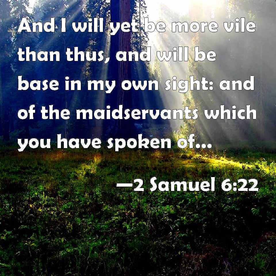 Choose a Background 2 Samuel 6:22 And I will yet be more vile than thus, and will be base in my own sight: and of the maidservants which you have spoken of, of them shall I be had in honor. KJV: And I will yet be more vile than thus, and will be base in mine own sight: and of the maidservants which thou hast spoken of, of them shall I be had in honour. DRB: I will both play and make myself meaner than I have done: and I will be little in my own eyes: and with the handmaid of whom thou speakest, I shall appear more glorious. DBT: And I will make myself yet more vile than thus, and will be base in mine own sight; and of the handmaids that thou hast spoken of, of them shall I be had in honour. ERV: And I will be yet more vile than thus, and will be base in mine own sight: but of the handmaids which thou hast spoken of, of them shall I be had in honour. WBT: And I shall yet be more vile than thus, and shall be base in my own sight: and by the maid-servants which thou hast spoken of, by them shall I be had in honor. WEB: I will be yet more vile than this, and will be base in my own sight. But of the handmaids of whom you have spoken, they shall honor me." YLT: and I have been more vile than this, and have been low in mine eyes, and with the handmaids whom thou hast spoken of, with them I am honoured.'Links 2 Samuel 6:22 NIV • 2 Samuel 6:22 NLT • 2 Samuel 6:22 ESV • 2 Samuel 6:22 NASB • 2 Samuel 6:22 KJV • 2 Samuel 6:22 Interlinear • 2 Samuel 6:22 Commentaries • 2 Samuel 6:22 Parallel Texts • 2 Samuel 6:22 Bible Apps • 2 Samuel 6:22 Parallel • Bible Hub |