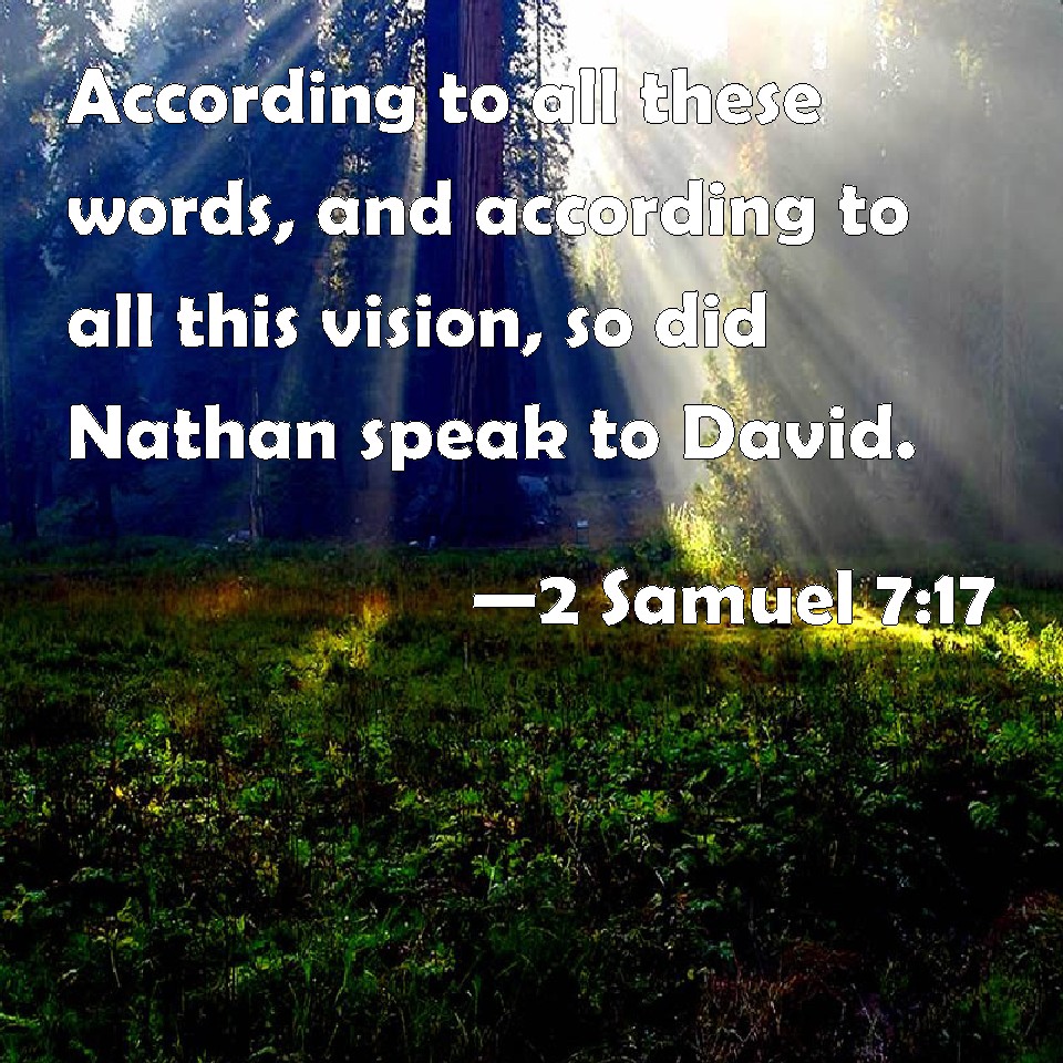 Choose a Background 2 Samuel 7:17 According to all these words, and according to all this vision, so did Nathan speak to David. KJV: According to all these words, and according to all this vision, so did Nathan speak unto David. DRB: According to all these words and according to all this vision, so did Nathan speak to David. DBT: According to all these words, and according to all this vision, so did Nathan speak to David. ERV: According to all these words, and according to all this vision, so did Nathan speak unto David. WBT: According to all these words, and according to all this vision, so did Nathan speak to David. WEB: According to all these words, and according to all this vision, so Nathan spoke to David. YLT: According to all these words, and according to all this vision, so spake Nathan unto David.Links 2 Samuel 7:17 NIV • 2 Samuel 7:17 NLT • 2 Samuel 7:17 ESV • 2 Samuel 7:17 NASB • 2 Samuel 7:17 KJV • 2 Samuel 7:17 Interlinear • 2 Samuel 7:17 Commentaries • 2 Samuel 7:17 Parallel Texts • 2 Samuel 7:17 Bible Apps • 2 Samuel 7:17 Parallel • Bible Hub |
