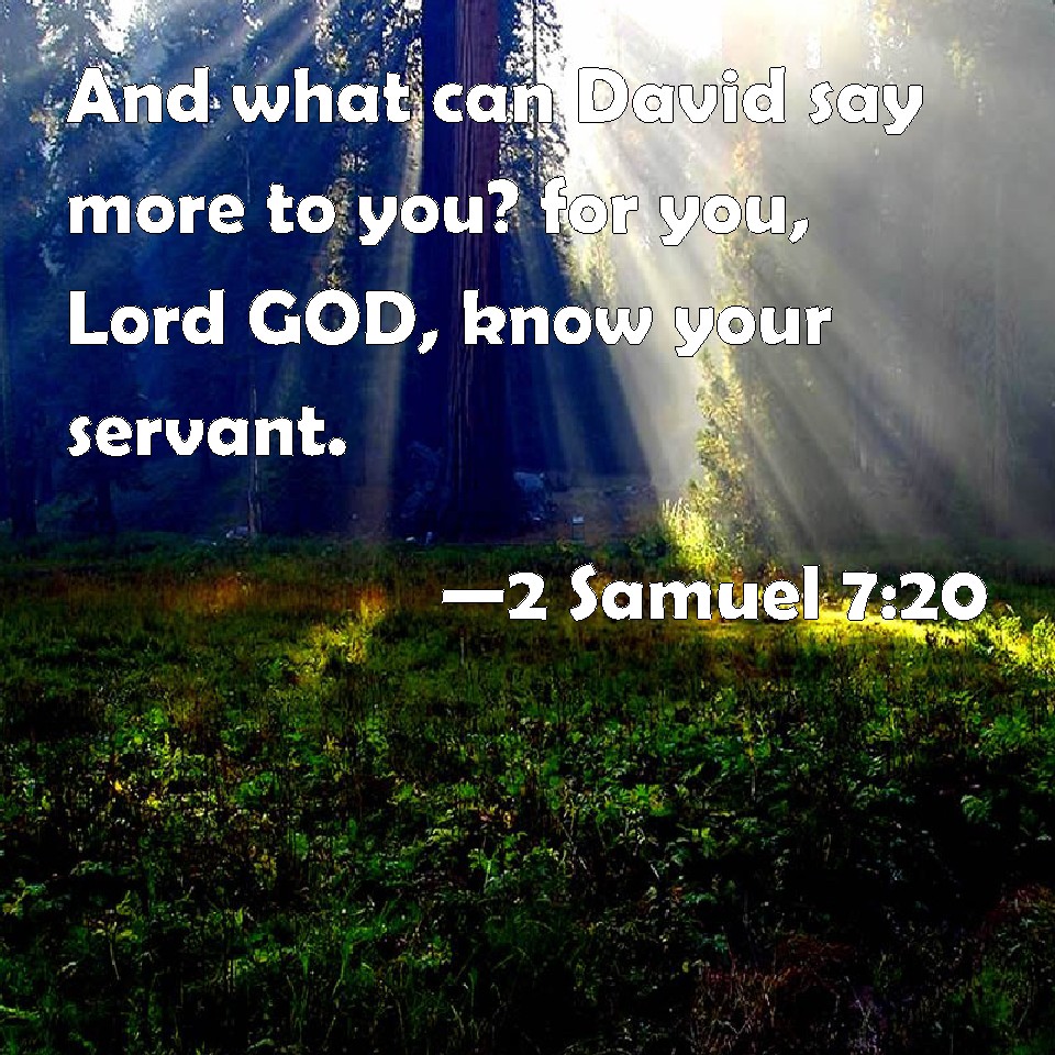 Choose a Background 2 Samuel 7:20 And what can David say more to you? for you, Lord GOD, know your servant. KJV: And what can David say more unto thee? for thou, Lord GOD, knowest thy servant. DRB: And what can David say more unto thee? for thou knowest thy servant, O Lord God: DBT: And what can David say more to thee? for thou, Lord Jehovah, knowest thy servant. ERV: And what can David say more unto thee? for thou knowest thy servant, O Lord GOD. WBT: And what can David say more to thee? for thou, Lord GOD, knowest thy servant. WEB: What more can David say to you? For you know your servant, Lord Yahweh. YLT: And what doth David add more to speak unto Thee? and Thou, Thou hast known Thy servant, Lord Jehovah.Links 2 Samuel 7:20 NIV • 2 Samuel 7:20 NLT • 2 Samuel 7:20 ESV • 2 Samuel 7:20 NASB • 2 Samuel 7:20 KJV • 2 Samuel 7:20 Interlinear • 2 Samuel 7:20 Commentaries • 2 Samuel 7:20 Parallel Texts • 2 Samuel 7:20 Bible Apps • 2 Samuel 7:20 Parallel • Bible Hub |