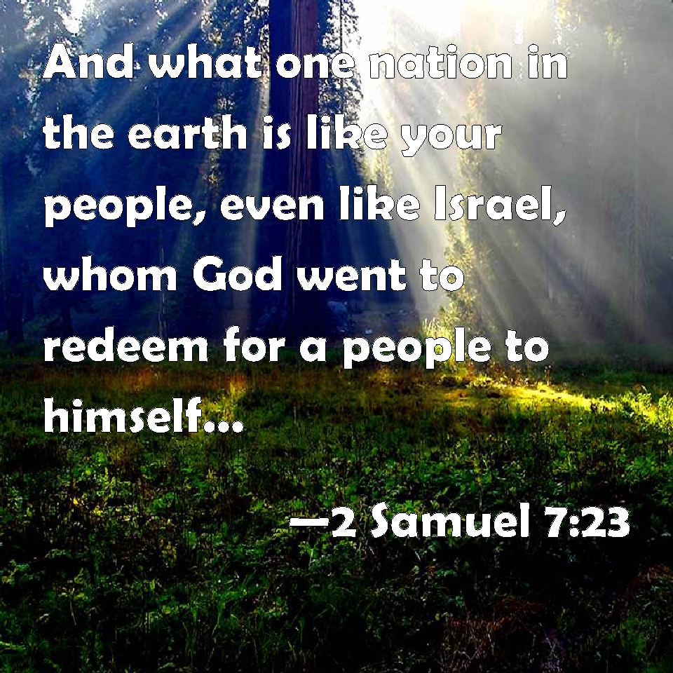 Choose a Background 2 Samuel 7:23 And what one nation in the earth is like your people, even like Israel, whom God went to redeem for a people to himself, and to make him a name, and to do for you great things and terrible, for your land, before your people, which you redeemed to you from Egypt, from the nations and their gods? KJV: And what one nation in the earth is like thy people, even like Israel, whom God went to redeem for a people to himself, and to make him a name, and to do for you great things and terrible, for thy land, before thy people, which thou redeemedst to thee from Egypt, from the nations and their gods? DRB: And what nation is there upon earth, as thy people Israel, whom God went to redeem for a people to himself, and to make him a name, and to do for them great and terrible things, upon the earth, before the face of thy people, whom thou redeemedst to thyself out of Egypt, from the nations and their gods. DBT: And who is like thy people, like Israel, the one nation in the earth that God went to redeem to be a people to himself, and to make himself a name, and to do for them great things and terrible, for thy land, before thy people, which thou redeemedst to thyself from Egypt, from the nations and their gods? ERV: And what one nation in the earth is like thy people, even like Israel, whom God went to redeem unto himself for a people, and to make him a name, and to do great things for you, and terrible things for thy land, before thy people, which thou redeemedst to thee out of Egypt, from the nations and their gods? WBT: And what one nation in the earth is like thy people, even like Israel, whom God went to redeem for a people to himself, and to make him a name, and to do for you great things and terrible, for thy land, before thy people which thou redeemedst to thee from Egypt, from the nations and their gods? WEB: What one nation in the earth is like your people, even like Israel, whom God went to redeem to himself for a people, and to make him a name, and to do great things for you, and awesome things for your land, before your people, whom you redeem to you out of Egypt, [from] the nations and their gods? YLT: And who is as Thy people, as Israel — one nation in the earth, whom God hath gone to redeem to Him for a people, and to make for Him a name — and to do for you the greatness — even fearful things for Thy land, at the presence of Thy people, whom Thou hast redeemed to Thee out of Egypt — among the nations and their gods?Links 2 Samuel 7:23 NIV • 2 Samuel 7:23 NLT • 2 Samuel 7:23 ESV • 2 Samuel 7:23 NASB • 2 Samuel 7:23 KJV • 2 Samuel 7:23 Interlinear • 2 Samuel 7:23 Commentaries • 2 Samuel 7:23 Parallel Texts • 2 Samuel 7:23 Bible Apps • 2 Samuel 7:23 Parallel • Bible Hub |