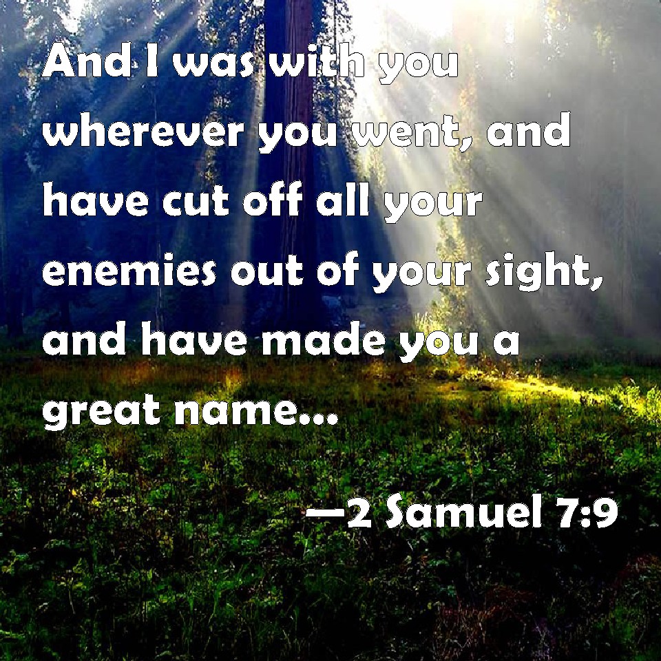 Choose a Background 2 Samuel 7:9 And I was with you wherever you went, and have cut off all your enemies out of your sight, and have made you a great name, like to the name of the great men that are in the earth. KJV: And I was with thee whithersoever thou wentest, and have cut off all thine enemies out of thy sight, and have made thee a great name, like unto the name of the great men that are in the earth. DRB: And I have been with thee wheresoever thou hast walked, and have slain all thy enemies from before thy face: and I have made thee a great man, like unto the name of the great ones that are on the earth. DBT: and I have been with thee whithersoever thou wentest, and have cut off all thine enemies from before thee, and have made thee a great name, like unto the name of the great men that are on the earth. ERV: and I have been with thee whithersoever thou wentest, and have cut off all thine enemies from before thee; and I will make thee a great name, like unto the name of the great ones that are in the earth. WBT: And I was with thee whithersoever thou wentest, and have cut off all thy enemies out of thy sight, and have made thee a great name, like to the name of the great men that are in the earth. WEB: I have been with you wherever you went, and have cut off all your enemies from before you. I will make you a great name, like the name of the great ones who are in the earth. YLT: and I am with thee whithersoever thou hast gone, and I cut off all thine enemies from thy presence, and have made for thee a great name, as the name of the great ones who are in the earth,Links 2 Samuel 7:9 NIV • 2 Samuel 7:9 NLT • 2 Samuel 7:9 ESV • 2 Samuel 7:9 NASB • 2 Samuel 7:9 KJV • 2 Samuel 7:9 Interlinear • 2 Samuel 7:9 Commentaries • 2 Samuel 7:9 Parallel Texts • 2 Samuel 7:9 Bible Apps • 2 Samuel 7:9 Parallel • Bible Hub |
