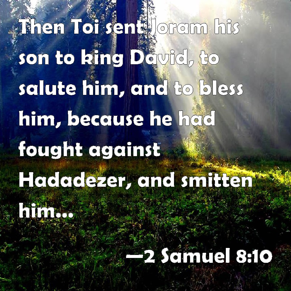 Choose a Background 2 Samuel 8:10 Then Toi sent Joram his son to king David, to salute him, and to bless him, because he had fought against Hadadezer, and smitten him: for Hadadezer had wars with Toi. And Joram brought with him vessels of silver, and vessels of gold, and vessels of brass: KJV: Then Toi sent Joram his son unto king David, to salute him, and to bless him, because he had fought against Hadadezer, and smitten him: for Hadadezer had wars with Toi. And Joram brought with him vessels of silver, and vessels of gold, and vessels of brass: DRB: And Thou sent Joram his son to king David, to salute him, and to congratulate with him, and to return him thanks: because he had fought against Adarezer, and had defeated him. For Thou was an enemy to Adarezer, and in his hand were vessels of gold, and vessels of silver, and vessels of brass: DBT: and Toi sent Joram his son to king David, to inquire of his welfare, and to congratulate him, because he had fought against Hadadezer and smitten him; for Hadadezer was continually at war with Toi. And he brought with him vessels of silver, and vessels of gold, and vessels of bronze. ERV: then Toi sent Joram his son unto king David, to salute him, and to bless him, because he had fought against Hadadezer and smitten him: for Hadadezer had wars with Toi. And Joram brought with him vessels of silver, and vessels of gold, and vessels of brass: WBT: Then Toi sent Joram his son to king David, to salute him, and to bless him, because he had fought against Hadadezer, and smitten him: (for Hadadezer had wars with Toi) and Joram brought with him vessels of silver, and vessels of gold, and vessels of brass: WEB: then Toi sent Joram his son to king David, to Greet him, and to bless him, because he had fought against Hadadezer and struck him: for Hadadezer had wars with Toi. [Joram] brought with him vessels of silver, and vessels of gold, and vessels of brass: YLT: and Toi sendeth Joram his son unto king David to ask of him of welfare, and to bless him, (because that he hath fought against Hadadezer, and smiteth him, for a man of wars with Toi had Hadadezer been), and in his hand have been vessels of silver, and vessels of gold, and vessels of brass,Links 2 Samuel 8:10 NIV • 2 Samuel 8:10 NLT • 2 Samuel 8:10 ESV • 2 Samuel 8:10 NASB • 2 Samuel 8:10 KJV • 2 Samuel 8:10 Interlinear • 2 Samuel 8:10 Commentaries • 2 Samuel 8:10 Parallel Texts • 2 Samuel 8:10 Bible Apps • 2 Samuel 8:10 Parallel • Bible Hub |