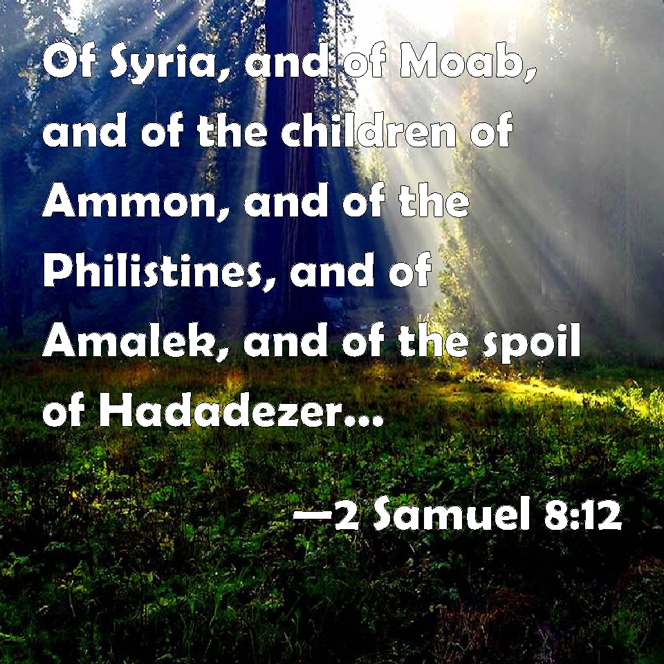 Choose a Background 2 Samuel 8:12 Of Syria, and of Moab, and of the children of Ammon, and of the Philistines, and of Amalek, and of the spoil of Hadadezer, son of Rehob, king of Zobah. KJV: Of Syria, and of Moab, and of the children of Ammon, and of the Philistines, and of Amalek, and of the spoil of Hadadezer, son of Rehob, king of Zobah. DRB: Of Syria, and of Moab, and of the children of Ammon, and of the Philistines, and of Amalec, and of the spoils of Adarezer the son of Rohob king of Soba. DBT: of the Syrians, and of the Moabites, and of the children of Ammon, and of the Philistines, and of the Amalekites, and of the spoil of Hadadezer, the son of Rehob, king of Zobah. ERV: of Syria, and of Moab, and of the children of Ammon, and of the Philistines, and of Amalek, and of the spoil of Hadadezer, son of Rehob, king of Zobah. WBT: Of Syria, and of Moab, and of the children of Ammon, and of the Philistines, and of Amalek, and of the spoil of Hadadezer son of Rehob, king of Zobah. WEB: of Syria, and of Moab, and of the children of Ammon, and of the Philistines, and of Amalek, and of the spoil of Hadadezer, son of Rehob, king of Zobah. YLT: of Aram, and of Moab, and of the Bene-Ammon, and of the Philistines, and of Amalek, and of the spoil of Hadadezer son of Rehob king of Zobah.Links 2 Samuel 8:12 NIV • 2 Samuel 8:12 NLT • 2 Samuel 8:12 ESV • 2 Samuel 8:12 NASB • 2 Samuel 8:12 KJV • 2 Samuel 8:12 Interlinear • 2 Samuel 8:12 Commentaries • 2 Samuel 8:12 Parallel Texts • 2 Samuel 8:12 Bible Apps • 2 Samuel 8:12 Parallel • Bible Hub |