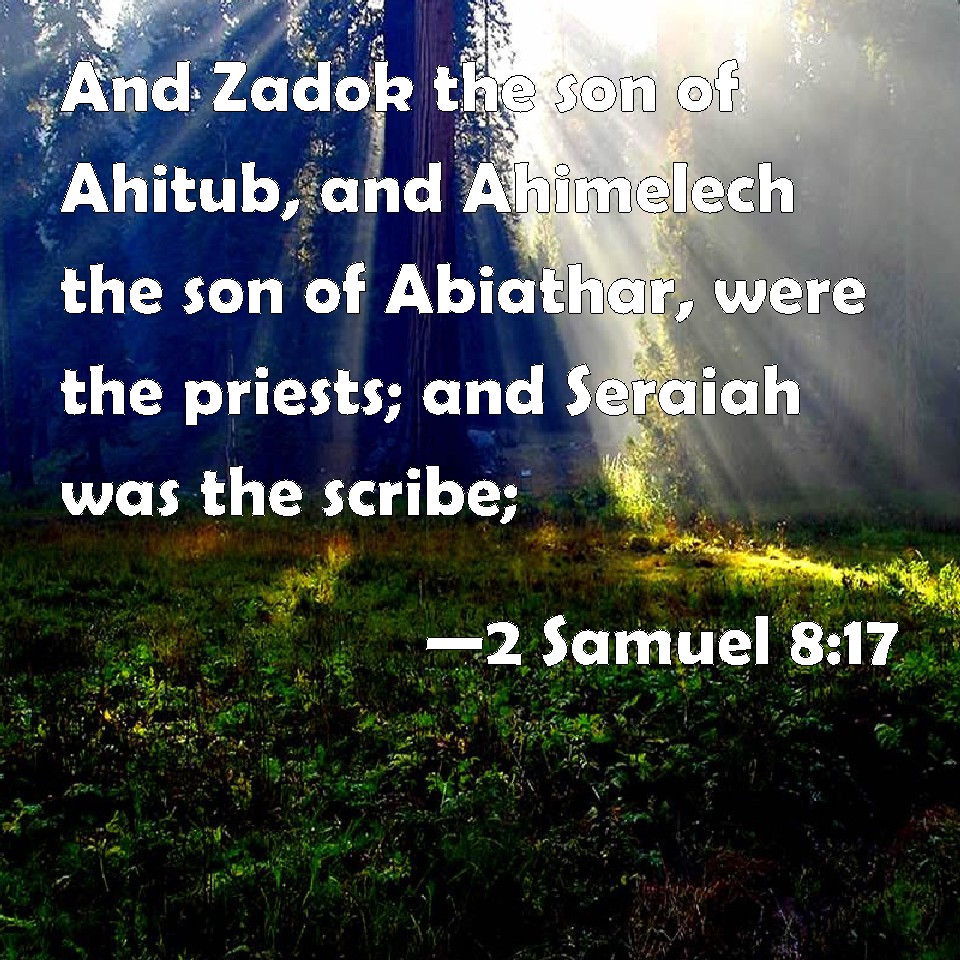 Choose a Background 2 Samuel 8:17 And Zadok the son of Ahitub, and Ahimelech the son of Abiathar, were the priests; and Seraiah was the scribe; KJV: And Zadok the son of Ahitub, and Ahimelech the son of Abiathar, were the priests; and Seraiah was the scribe; DRB: And Sadoc the son of Achitob, and Achimelech the son of Abiathar, were the priests: and Saraias was the scribe: DBT: and Zadok the son of Ahitub, and Ahimelech the son of Abiathar, were the priests; and Seraiah was scribe; ERV: and Zadok the son of Ahitub, and Ahimelech the son of Abiathar, were priests; and Seraiah was scribe; WBT: And Zadok the son of Ahitub, and Ahimelech the son of Abiathar, were the priests: and Seraiah was the scribe; WEB: and Zadok the son of Ahitub, and Ahimelech the son of Abiathar, were priests; and Seraiah was scribe; YLT: and Zadok son of Ahitub, and Ahimelech son of Abiathar, are priests, and Seraiah is scribe,Links 2 Samuel 8:17 NIV • 2 Samuel 8:17 NLT • 2 Samuel 8:17 ESV • 2 Samuel 8:17 NASB • 2 Samuel 8:17 KJV • 2 Samuel 8:17 Interlinear • 2 Samuel 8:17 Commentaries • 2 Samuel 8:17 Parallel Texts • 2 Samuel 8:17 Bible Apps • 2 Samuel 8:17 Parallel • Bible Hub |