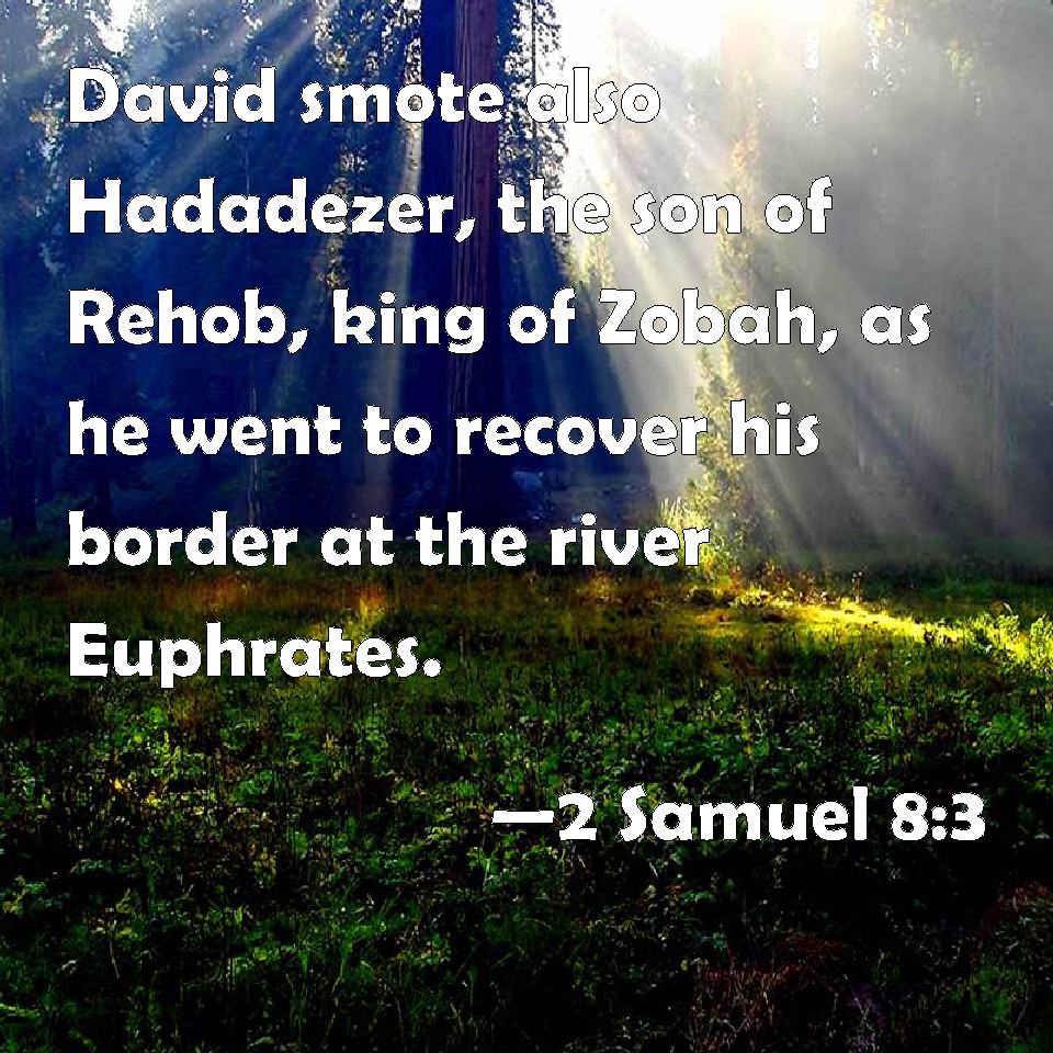 Choose a Background 2 Samuel 8:3 David smote also Hadadezer, the son of Rehob, king of Zobah, as he went to recover his border at the river Euphrates. KJV: David smote also Hadadezer, the son of Rehob, king of Zobah, as he went to recover his border at the river Euphrates. DRB: David defeated also Adarezer the son of Rohob king of Soba, when he went to extend his dominion over the river Euphrates. DBT: And David smote Hadadezer, the son of Rehob, king of Zobah, as he went to recover his dominion by the river Euphrates. ERV: David smote also Hadadezer the son of Rehob, king of Zobah, as he went to recover his dominion at the River. WBT: David smote also Hadadezer, the son of Rehob, king of Zobah, as he went to recover his border at the river Euphrates. WEB: David struck also Hadadezer the son of Rehob, king of Zobah, as he went to recover his dominion at the River. YLT: And David smiteth Hadadezer son of Rehob, king of Zobah, in his going to bring back his power by the River Euphrates;Links 2 Samuel 8:3 NIV • 2 Samuel 8:3 NLT • 2 Samuel 8:3 ESV • 2 Samuel 8:3 NASB • 2 Samuel 8:3 KJV • 2 Samuel 8:3 Interlinear • 2 Samuel 8:3 Commentaries • 2 Samuel 8:3 Parallel Texts • 2 Samuel 8:3 Bible Apps • 2 Samuel 8:3 Parallel • Bible Hub |