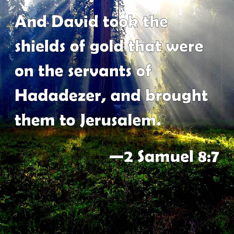 2 Samuel 8:7 And David took the shields of gold that were on the servants of Hadadezer, and brought them to Jerusalem.