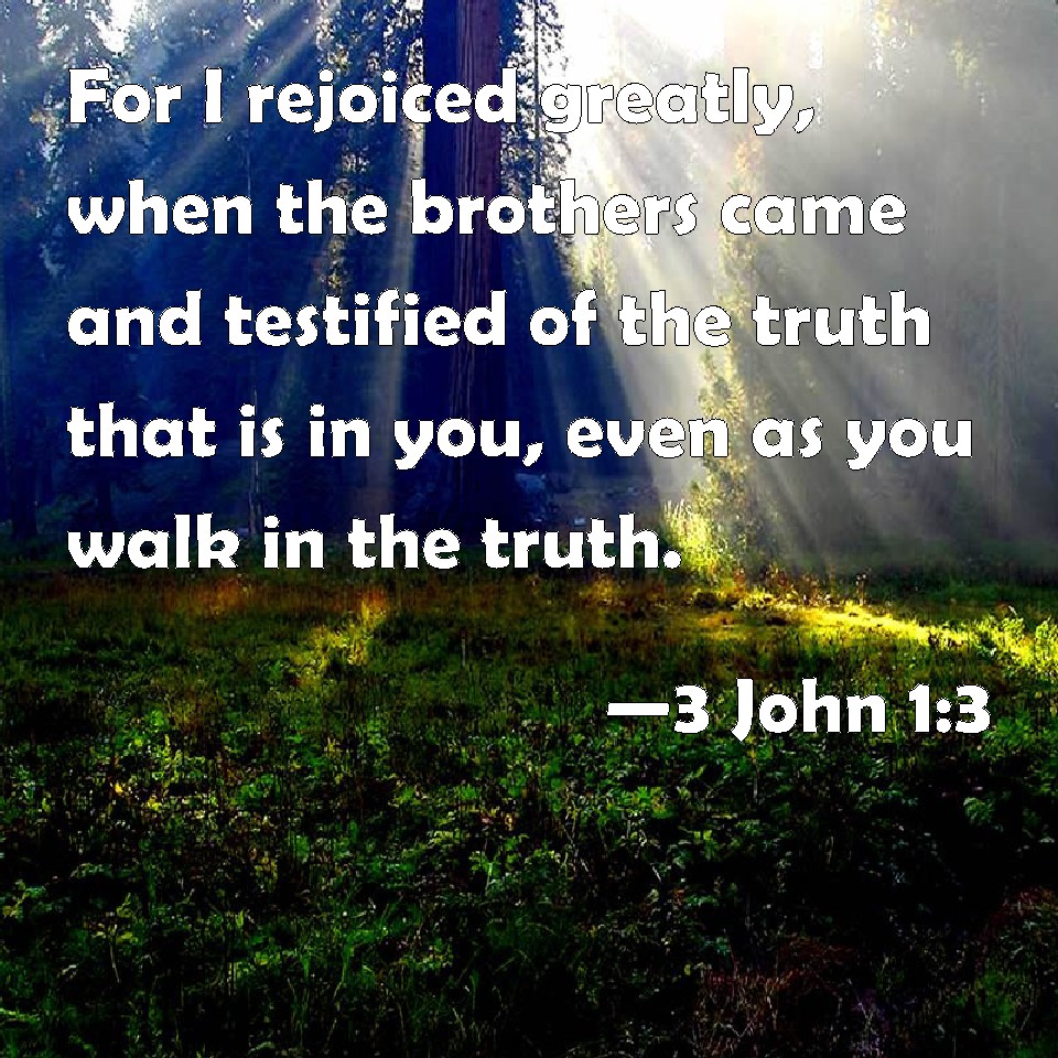 Choose a Background 3 John 1:3 For I rejoiced greatly, when the brothers came and testified of the truth that is in you, even as you walk in the truth. KJV: For I rejoiced greatly, when the brethren came and testified of the truth that is in thee, even as thou walkest in the truth. DRB: I was exceedingly glad when the brethren came and gave testimony to the truth in thee, even as thou walkest in the truth. DBT: For I rejoiced exceedingly when the brethren came and bore testimony to thy holding fast the truth, even as thou walkest in truth. ERV: For I rejoiced greatly, when brethren came and bare witness unto thy truth, even as thou walkest in truth. WBT: For I rejoiced greatly, when the brethren came and testified of the truth that is in thee, even as thou walkest in the truth. WEB: For I rejoiced greatly, when brothers came and testified about your truth, even as you walk in truth. YLT: for I rejoiced exceedingly, brethren coming and testifying of the truth in thee, even as thou in truth dost walk;Links 3 John 1:3 NIV • 3 John 1:3 NLT • 3 John 1:3 ESV • 3 John 1:3 NASB • 3 John 1:3 KJV • 3 John 1:3 Interlinear • 3 John 1:3 Commentaries • 3 John 1:3 Parallel Texts • 3 John 1:3 Bible Apps • 3 John 1:3 Parallel • Bible Hub |