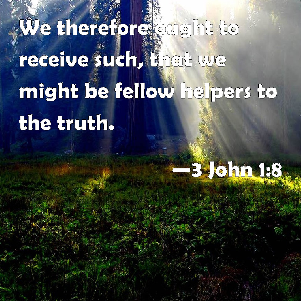 Choose a Background 3 John 1:8 We therefore ought to receive such, that we might be fellow helpers to the truth. KJV: We therefore ought to receive such, that we might be fellowhelpers to the truth. DRB: We therefore ought to receive such, that we may be fellow helpers of the truth. DBT: We therefore ought to receive such, that we may be fellow-workers with the truth. ERV: We therefore ought to welcome such, that we may be fellow-workers with the truth. WBT: We therefore ought to receive such, that we may be fellow-helpers to the truth. WEB: We therefore ought to receive such, that we may be fellow workers for the truth. YLT: we, then, ought to receive such, that fellow-workers we may become to the truth.Links 3 John 1:8 NIV • 3 John 1:8 NLT • 3 John 1:8 ESV • 3 John 1:8 NASB • 3 John 1:8 KJV • 3 John 1:8 Interlinear • 3 John 1:8 Commentaries • 3 John 1:8 Parallel Texts • 3 John 1:8 Bible Apps • 3 John 1:8 Parallel • Bible Hub |