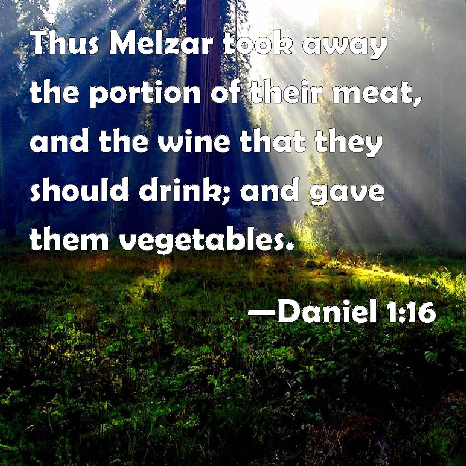 Choose a Background Daniel 1:16 Thus Melzar took away the portion of their meat, and the wine that they should drink; and gave them vegetables. KJV: Thus Melzar took away the portion of their meat, and the wine that they should drink; and gave them pulse. DRB: So Malasar took their portions, and the wine that they should drink: and he gave them pulse. DBT: So the steward took away their delicate food, and the wine that they should drink; and gave them pulse. ERV: So the steward took away their meat, and the wine that they should drink, and gave them pulse. WBT: Thus Melzar took away the portion of their food, and the wine that they should drink, and gave them pulse. WEB: So the steward took away their dainties, and the wine that they should drink, and gave them pulse. YLT: And the Meltzar is taking away their portion of food, and the wine of their drink, and is giving to them vegetables.Links Daniel 1:16 NIV • Daniel 1:16 NLT • Daniel 1:16 ESV • Daniel 1:16 NASB • Daniel 1:16 KJV • Daniel 1:16 Interlinear • Daniel 1:16 Commentaries • Daniel 1:16 Parallel Texts • Daniel 1:16 Bible Apps • Daniel 1:16 Parallel • Bible Hub |