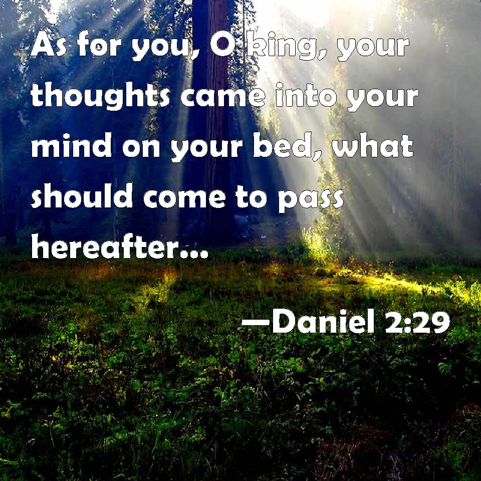 Choose a Background Daniel 2:29 As for you, O king, your thoughts came into your mind on your bed, what should come to pass hereafter: and he that reveals secrets makes known to you what shall come to pass. KJV: As for thee, O king, thy thoughts came into thy mind upon thy bed, what should come to pass hereafter: and he that revealeth secrets maketh known to thee what shall come to pass. DRB: Thou, O king, didst begin to think in thy bed, what should come to pass hereafter: and he that revealeth mysteries shewed thee what shall come to pass. DBT: as for thee, O king, thy thoughts arose upon thy bed, what should come to pass hereafter; and he that revealeth secrets hath made known to thee what shall come to pass. ERV: as for thee, O king, thy thoughts came into thy mind upon thy bed, what should come to pass hereafter: and he that revealeth secrets hath made known to thee what shall come to pass. WBT: As for thee, O king, thy thoughts came into thy mind upon thy bed, what should come to pass hereafter: and he that revealeth secrets maketh known to thee what shall come to pass. WEB: as for you, O king, your thoughts came [into your mind] on your bed, what should happen hereafter; and he who reveals secrets has made known to you what shall happen. YLT: Thou, O king, thy thoughts on thy bed have come up concerning that which is to be after this, and the Revealer of secrets hath caused thee to know that which is to be.Links Daniel 2:29 NIV • Daniel 2:29 NLT • Daniel 2:29 ESV • Daniel 2:29 NASB • Daniel 2:29 KJV • Daniel 2:29 Interlinear • Daniel 2:29 Commentaries • Daniel 2:29 Parallel Texts • Daniel 2:29 Bible Apps • Daniel 2:29 Parallel • Bible Hub |