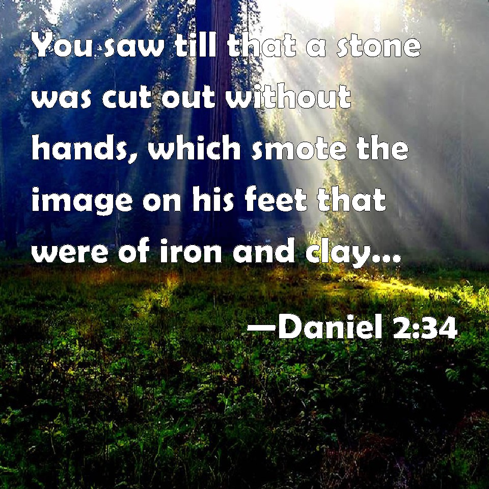 Choose a Background Daniel 2:34 You saw till that a stone was cut out without hands, which smote the image on his feet that were of iron and clay, and broke them to pieces. KJV: Thou sawest till that a stone was cut out without hands, which smote the image upon his feet that were of iron and clay, and brake them to pieces. DRB: Thus thou sawest, till a stone was cut out of a mountain without hands: and it struck the statue upon the feet thereof that were of iron and of clay, and broke them in pieces. DBT: Thou sawest till a stone was cut out without hands; and it smote the image upon its feet of iron and clay, and broke them to pieces. ERV: Thou sawest till that a stone was cut out without hands, which smote the image upon his feet that were of iron and clay, and brake them in pieces. WBT: Thou sawest till a stone was cut out without hands, which smote the image upon his feet that were of iron and clay, and broke them to pieces. WEB: You saw until a stone was cut out without hands, which struck the image on its feet that were of iron and clay, and broke them in pieces. YLT: Thou wast looking till that a stone hath been cut out without hands, and it hath smitten the image on its feet, that are of iron and of clay, and it hath broken them small;Links Daniel 2:34 NIV • Daniel 2:34 NLT • Daniel 2:34 ESV • Daniel 2:34 NASB • Daniel 2:34 KJV • Daniel 2:34 Interlinear • Daniel 2:34 Commentaries • Daniel 2:34 Parallel Texts • Daniel 2:34 Bible Apps • Daniel 2:34 Parallel • Bible Hub |