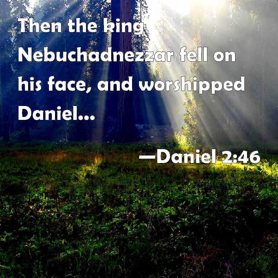 Choose a Background Daniel 2:46 Then the king Nebuchadnezzar fell on his face, and worshipped Daniel, and commanded that they should offer an oblation and sweet odors to him. KJV: Then the king Nebuchadnezzar fell upon his face, and worshipped Daniel, and commanded that they should offer an oblation and sweet odours unto him. DRB: Then king Nabuchodonosor fell on his face, and worshipped Daniel, and commanded that they should offer in sacrifice to him victims and incense. DBT: Then king Nebuchadnezzar fell on his face and worshipped Daniel, and commanded that they should offer an oblation and sweet odours unto him. ERV: Then the king Nebuchadnezzar fell upon his face, and worshipped Daniel, and commanded that they should offer an oblation and sweet odours unto him. WBT: Then the king Nebuchadnezzar fell upon his face, and worshiped Daniel, and commanded that they should offer an oblation and sweet odors to him. WEB: Then the king Nebuchadnezzar fell on his face, and worshiped Daniel, and commanded that they should offer an offering and sweet odors to him. YLT: Then hath king Nebuchadnezzar fallen on his face, and to Daniel he hath done obeisance, and present, and sweet things, he hath said to pour out to him.Links Daniel 2:46 NIV • Daniel 2:46 NLT • Daniel 2:46 ESV • Daniel 2:46 NASB • Daniel 2:46 KJV • Daniel 2:46 Interlinear • Daniel 2:46 Commentaries • Daniel 2:46 Parallel Texts • Daniel 2:46 Bible Apps • Daniel 2:46 Parallel • Bible Hub |