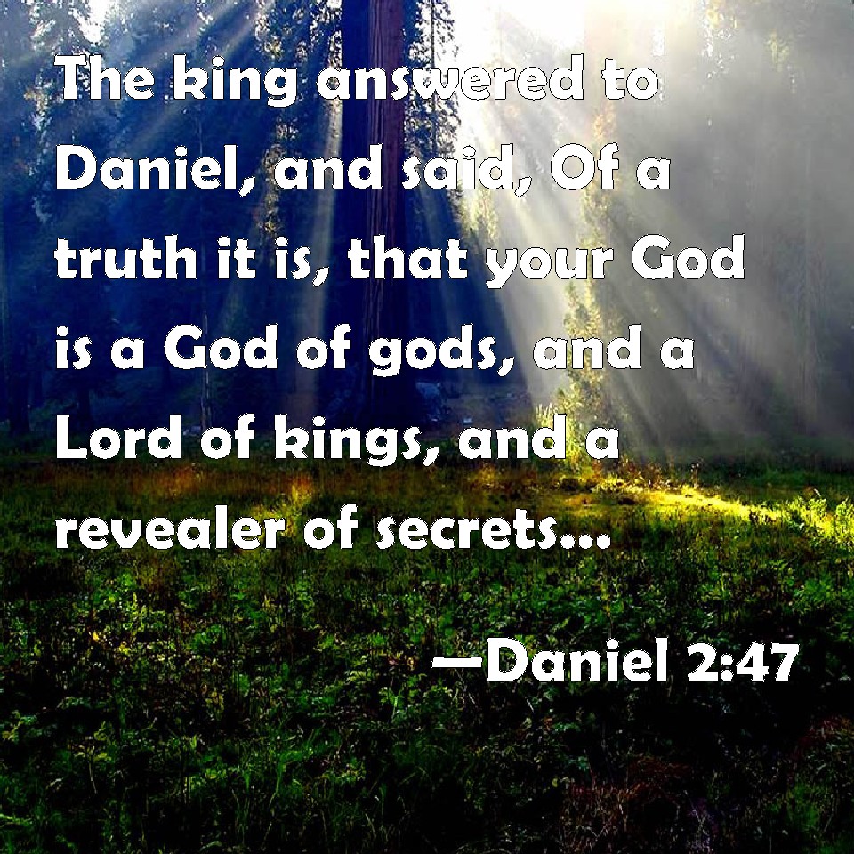 Choose a Background Daniel 2:47 The king answered to Daniel, and said, Of a truth it is, that your God is a God of gods, and a Lord of kings, and a revealer of secrets, seeing you could reveal this secret. KJV: The king answered unto Daniel, and said, Of a truth it is, that your God is a God of gods, and a Lord of kings, and a revealer of secrets, seeing thou couldest reveal this secret. DRB: And the king spoke to Daniel, and said: Verily your God is the God of gods, and Lord of kings, and a revealer of hidden things: seeing thou couldst discover this secret. DBT: The king answered Daniel and said, Of a truth it is that your God is the God of gods, and the Lord of kings, and a revealer of secrets, because thou wast able to reveal this secret. ERV: The king answered unto Daniel, and said, Of a truth your God is the God of gods, and the Lord of kings, and a revealer of secrets, sing thou hast been able to reveal this secret. WBT: The king answered to Daniel, and said, Of a truth it is, that your God is a God of gods, and a Lord of kings, and a revealer of secrets, seeing thou couldst reveal this secret. WEB: The king answered to Daniel, and said, Of a truth your God is the God of gods, and the Lord of kings, and a revealer of secrets, since you have been able to reveal this secret. YLT: The king hath answered Daniel and said, 'Of a truth it is that your God is a God of gods, and a Lord of kings, and a revealer of secrets, since thou hast been able to reveal this secret.'Links Daniel 2:47 NIV • Daniel 2:47 NLT • Daniel 2:47 ESV • Daniel 2:47 NASB • Daniel 2:47 KJV • Daniel 2:47 Interlinear • Daniel 2:47 Commentaries • Daniel 2:47 Parallel Texts • Daniel 2:47 Bible Apps • Daniel 2:47 Parallel • Bible Hub |