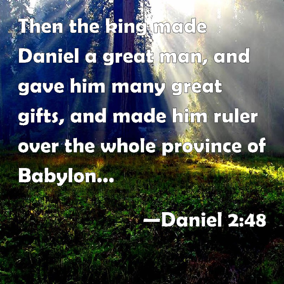 Choose a Background Daniel 2:48 Then the king made Daniel a great man, and gave him many great gifts, and made him ruler over the whole province of Babylon, and chief of the governors over all the wise men of Babylon. KJV: Then the king made Daniel a great man, and gave him many great gifts, and made him ruler over the whole province of Babylon, and chief of the governors over all the wise men of Babylon. DRB: Then the king advanced Daniel to a high station, and gave him many and great gifts: and he made him governor over all the provinces of Babylon, and chief of the magistrates over all the wise men of Babylon. DBT: Then the king made Daniel great, and gave him many great gifts, and made him ruler over the whole province of Babylon, and chief of the governors over all the wise men of Babylon. ERV: Then the king made Daniel great, and gave him many great gifts, and made him to rule over the whole province of Babylon, and to be chief governor over all the wise men of Babylon. WBT: Then the king made Daniel a great man, and gave him many great gifts, and made him ruler over the whole province of Babylon, and chief of the governors over all the wise men of Babylon. WEB: Then the king made Daniel great, and gave him many great gifts, and made him to rule over the whole province of Babylon, and to be chief governor over all the wise men of Babylon. YLT: Then the king hath made Daniel great, and many great gifts he hath given to him, and hath caused him to rule over all the province of Babylon, and chief of the perfects over all the wise men of Babylon.Links Daniel 2:48 NIV • Daniel 2:48 NLT • Daniel 2:48 ESV • Daniel 2:48 NASB • Daniel 2:48 KJV • Daniel 2:48 Interlinear • Daniel 2:48 Commentaries • Daniel 2:48 Parallel Texts • Daniel 2:48 Bible Apps • Daniel 2:48 Parallel • Bible Hub |