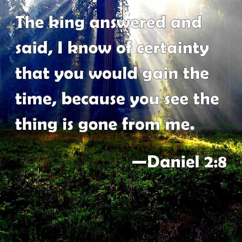 Choose a Background Daniel 2:8 The king answered and said, I know of certainty that you would gain the time, because you see the thing is gone from me. KJV: The king answered and said, I know of certainty that ye would gain the time, because ye see the thing is gone from me. DRB: The king answered, and said: I know for certain that you seek to gain time, since you know that the thing is gone from me. DBT: The king answered and said, I know of a certainty that ye would gain time, because ye see the word is gone forth from me; ERV: The king answered and said, I know of a certain that ye would gain time, because ye see the thing is gone from me. WBT: The king answered and said, I know of certainty that ye would gain the time, because ye see the thing is gone from me. WEB: The king answered, I know of a certainty that you would gain time, because you see the thing is gone from me. YLT: The king hath answered and said, 'Of a truth I know that time ye are gaining, because that ye have seen that the thing is gone from me,Links Daniel 2:8 NIV • Daniel 2:8 NLT • Daniel 2:8 ESV • Daniel 2:8 NASB • Daniel 2:8 KJV • Daniel 2:8 Interlinear • Daniel 2:8 Commentaries • Daniel 2:8 Parallel Texts • Daniel 2:8 Bible Apps • Daniel 2:8 Parallel • Bible Hub |
