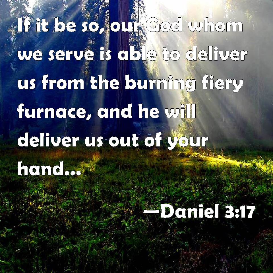 Choose a Background Daniel 3:17 If it be so, our God whom we serve is able to deliver us from the burning fiery furnace, and he will deliver us out of your hand, O king. KJV: If it be so, our God whom we serve is able to deliver us from the burning fiery furnace, and he will deliver us out of thine hand, O king. DRB: For behold our God, whom we worship, is able to save us from the furnace of burning fire, and to deliver us out of thy hands, O king. DBT: If it be so, our God whom we serve is able to deliver us from the burning fiery furnace, and he will deliver us out of thy hand, O king. ERV: If it be so, our God whom we serve is able to deliver us from the burning fiery furnace; and he will deliver us out of thine hand, O king. WBT: If it is so, our God whom we serve is able to deliver us from the burning fiery furnace, and he will deliver us out of thy hand, O king. WEB: If it be [so], our God whom we serve is able to deliver us from the burning fiery furnace; and he will deliver us out of your hand, O king. YLT: Lo, it is; our God whom we are serving, is able to deliver us from a burning fiery furnace; and from thy hand, O king, He doth deliver.Links Daniel 3:17 NIV • Daniel 3:17 NLT • Daniel 3:17 ESV • Daniel 3:17 NASB • Daniel 3:17 KJV • Daniel 3:17 Interlinear • Daniel 3:17 Commentaries • Daniel 3:17 Parallel Texts • Daniel 3:17 Bible Apps • Daniel 3:17 Parallel • Bible Hub |