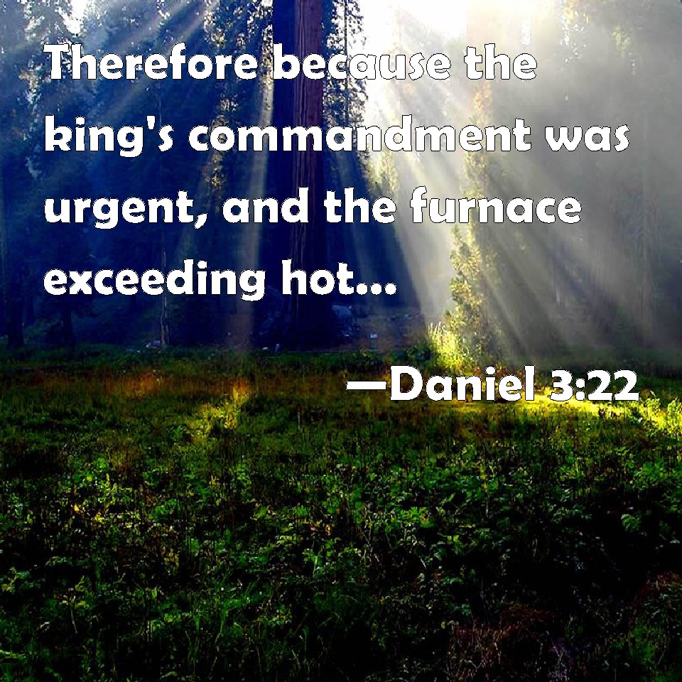 Choose a Background Daniel 3:22 Therefore because the king's commandment was urgent, and the furnace exceeding hot, the flames of the fire slew those men that took up Shadrach, Meshach, and Abednego. KJV: Therefore because the king's commandment was urgent, and the furnace exceeding hot, the flame of the fire slew those men that took up Shadrach, Meshach, and Abednego. DRB: For the king's commandment was urgent, and the furnace was heated exceedingly. And the flame of the fire slew those men that had cast in Sidrach, Misach, and Abdenago. DBT: Forasmuch as the king's commandment was rigorous, and the furnace exceeding hot, the flame of the fire slew those men that had taken up Shadrach, Meshach, and Abed-nego. ERV: Therefore because the king's commandment was urgent, and the furnace exceeding hot, the flame of the fire slew those men that took up Shadrach, Meshach, and Abed-nego. WBT: Therefore because the king's commandment was urgent, and the furnace exceeding hot, the flame of the fire killed those men that took up Shadrach, Meshach, and Abed-nego. WEB: Therefore because the king's commandment was urgent, and the furnace exceeding hot, the flame of the fire killed those men who took up Shadrach, Meshach, and Abednego. YLT: Therefore, because that the word of the king is urgent, and the furnace heated exceedingly, those men who have taken up Shadrach, Meshach, and Abed-Nego — killed them hath the spark of the fire.Links Daniel 3:22 NIV • Daniel 3:22 NLT • Daniel 3:22 ESV • Daniel 3:22 NASB • Daniel 3:22 KJV • Daniel 3:22 Interlinear • Daniel 3:22 Commentaries • Daniel 3:22 Parallel Texts • Daniel 3:22 Bible Apps • Daniel 3:22 Parallel • Bible Hub |