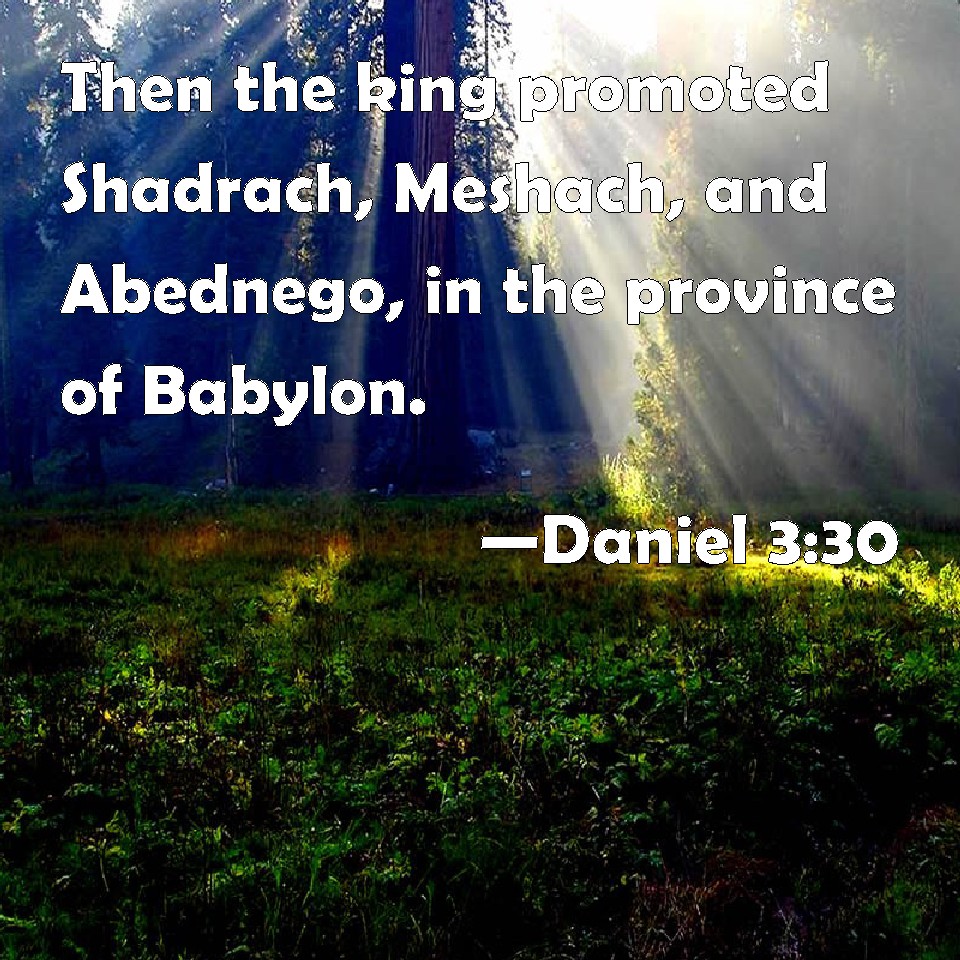 Choose a Background Daniel 3:30 Then the king promoted Shadrach, Meshach, and Abednego, in the province of Babylon. KJV: Then the king promoted Shadrach, Meshach, and Abednego, in the province of Babylon. DRB: Then the king promoted Sidrach, Misach, and Abdenago, in the province of Babylon. DBT: Then the king promoted Shadrach, Meshach, and Abed-nego in the province of Babylon. ERV: Then the king promoted Shadrach, Meshach, and Abed-nego, in the province of Babylon. WBT: Then the king promoted Shadrach, Meshach, and Abed-nego, in the province of Babylon. WEB: Then the king promoted Shadrach, Meshach, and Abednego in the province of Babylon. YLT: Then the king hath caused Shadrach, Meshach, and Abed-Nego, to prosper in the province of Babylon.Links Daniel 3:30 NIV • Daniel 3:30 NLT • Daniel 3:30 ESV • Daniel 3:30 NASB • Daniel 3:30 KJV • Daniel 3:30 Interlinear • Daniel 3:30 Commentaries • Daniel 3:30 Parallel Texts • Daniel 3:30 Bible Apps • Daniel 3:30 Parallel • Bible Hub |