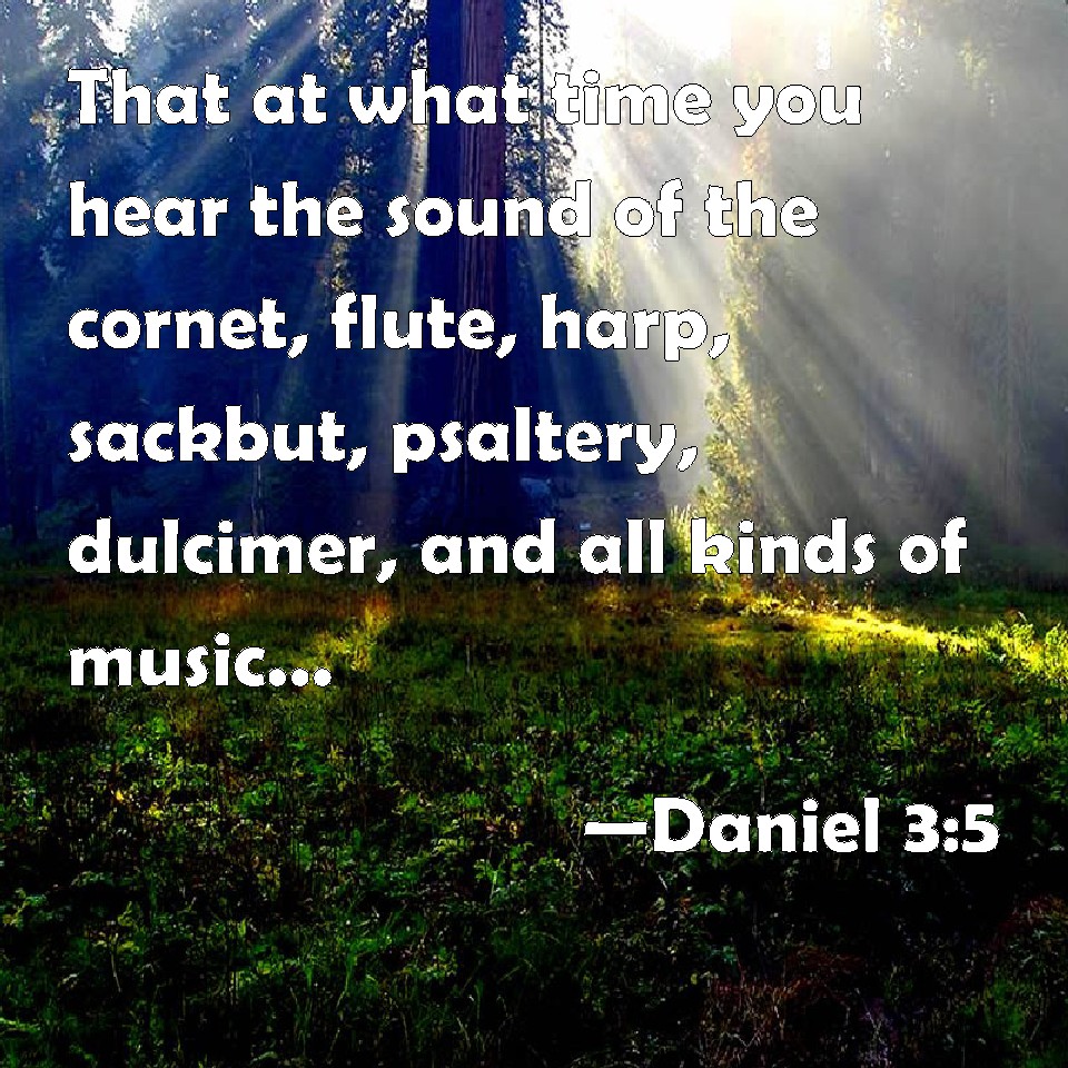 Choose a Background Daniel 3:5 That at what time you hear the sound of the cornet, flute, harp, sackbut, psaltery, dulcimer, and all kinds of music, you fall down and worship the golden image that Nebuchadnezzar the king has set up: KJV: That at what time ye hear the sound of the cornet, flute, harp, sackbut, psaltery, dulcimer, and all kinds of musick, ye fall down and worship the golden image that Nebuchadnezzar the king hath set up: DRB: That in the hour that you shall hear the sound of the trumpet, and of the flute, and of the harp, of the sackbut, and of the psaltery, and of the symphony, and of all kind of music; ye fall down and adore the golden statue which king Nabuchodonosor hath set up. DBT: that at what time ye hear the sound of the cornet, pipe, lute, sambuca, psaltery, bagpipe, and all kinds of music, ye fall down and worship the golden image that Nebuchadnezzar the king hath set up; ERV: that at what time ye hear the sound of the cornet, flute, harp, sackbut, psaltery, dulcimer, and all kinds of music, ye fall down and worship the golden image that Nebuchadnezzar the king hath set up: WBT: That at what time ye hear the sound of the cornet, flute, harp, sackbut, psaltery, dulcimer, and all kinds of music, ye fall down and worship the golden image that Nebuchadnezzar the king hath set up. WEB: that whenever you hear the sound of the horn, flute, zither, lyre, harp, pipe, and all kinds of music, you fall down and worship the golden image that Nebuchadnezzar the king has set up; YLT: at the time that ye hear the voice of the cornet, the flute, the harp, the sackbut, the psaltery, the symphony, and all kinds of music, ye fall down and do obeisance to the golden image that Nebuchadnezzar the king hath raised up:Links Daniel 3:5 NIV • Daniel 3:5 NLT • Daniel 3:5 ESV • Daniel 3:5 NASB • Daniel 3:5 KJV • Daniel 3:5 Interlinear • Daniel 3:5 Commentaries • Daniel 3:5 Parallel Texts • Daniel 3:5 Bible Apps • Daniel 3:5 Parallel • Bible Hub |