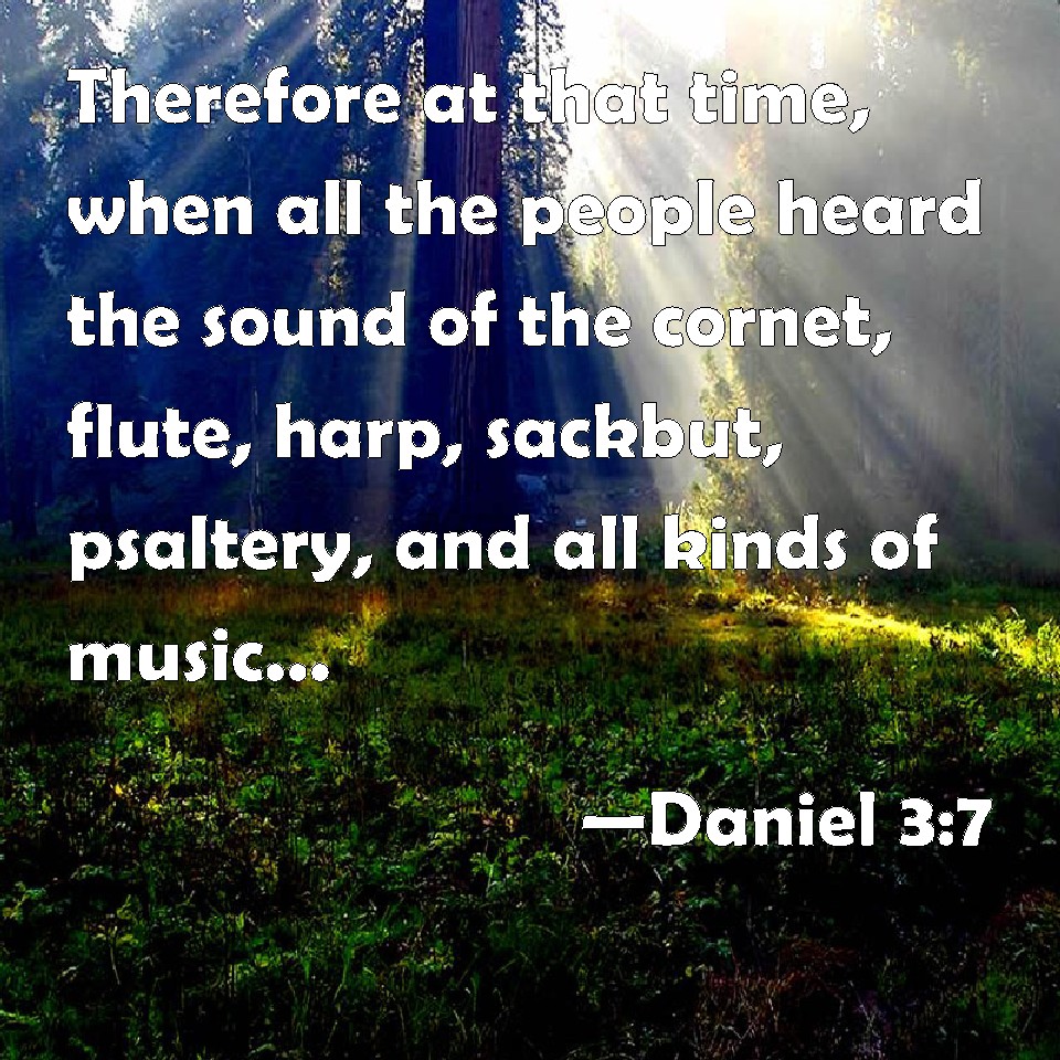 Choose a Background Daniel 3:7 Therefore at that time, when all the people heard the sound of the cornet, flute, harp, sackbut, psaltery, and all kinds of music, all the people, the nations, and the languages, fell down and worshipped the golden image that Nebuchadnezzar the king had set up. KJV: Therefore at that time, when all the people heard the sound of the cornet, flute, harp, sackbut, psaltery, and all kinds of musick, all the people, the nations, and the languages, fell down and worshipped the golden image that Nebuchadnezzar the king had set up. DRB: Upon this therefore, at the time when all the people heard the sound of the trumpet, the flute, and the harp, of the sackbut, and the psaltery, of the symphony, and of all kind of music: all the nations, tribes, and languages fell down and adored the golden statue which king Nabuchodonosor had set up. DBT: Therefore at that time when all the peoples heard the sound of the cornet, pipe, lute, sambuca, psaltery, and all kinds of music, all the peoples, the nations, and the languages fell down and worshipped the golden image that Nebuchadnezzar the king had set up. ERV: Therefore at that time, when all the peoples heard the sound of the cornet, flute, harp, sackbut, psaltery, and all kinds of music, all the peoples, the nations, and the languages, fell down and worshipped the golden image that Nebuchadnezzar the king had set up. WBT: Therefore at that time, when all the people heard the sound of the cornet, flute, harp, sackbut, psaltery, and all kinds of music, all the people, the nations, and the languages, fell down and worshiped the golden image that Nebuchadnezzar the king had set up. WEB: Therefore at that time, when all the peoples heard the sound of the horn, flute, zither, lyre, harp, pipe, and all kinds of music, all the peoples, the nations, and the languages, fell down and worshiped the golden image that Nebuchadnezzar the king had set up. YLT: Therefore at that time, when all the peoples are hearing the voice of the cornet, the flute, the harp, the sackbut, the psaltery, and all kinds of music, falling down are all the peoples, nations and languages, doing obeisance to the golden image that Nebuchadnezzar the king hath raised up.Links Daniel 3:7 NIV • Daniel 3:7 NLT • Daniel 3:7 ESV • Daniel 3:7 NASB • Daniel 3:7 KJV • Daniel 3:7 Interlinear • Daniel 3:7 Commentaries • Daniel 3:7 Parallel Texts • Daniel 3:7 Bible Apps • Daniel 3:7 Parallel • Bible Hub |