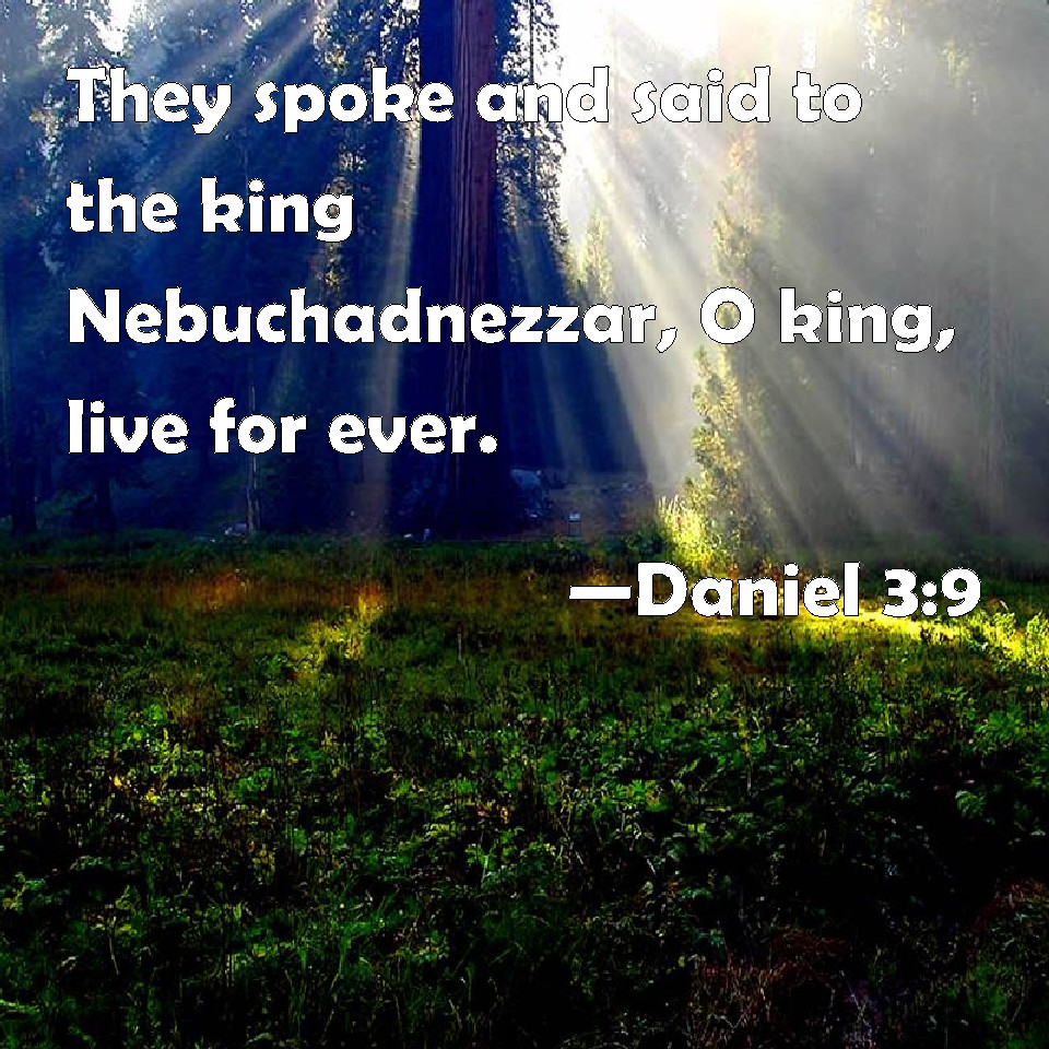 Choose a Background Daniel 3:9 They spoke and said to the king Nebuchadnezzar, O king, live for ever. KJV: They spake and said to the king Nebuchadnezzar, O king, live for ever. DRB: And said to king Nabuchodonosor: O king, live for ever: DBT: They spoke and said to the king Nebuchadnezzar, O king, live for ever! ERV: They answered and said to Nebuchadnezzar the king, O king, live for ever. WBT: They spoke and said to the king Nebuchadnezzar, O king, live for ever. WEB: They answered Nebuchadnezzar the king, O king, live for ever. YLT: they have answered, yea, they are saying to Nebuchadnezzar the king, 'O king, to the ages live!Links Daniel 3:9 NIV • Daniel 3:9 NLT • Daniel 3:9 ESV • Daniel 3:9 NASB • Daniel 3:9 KJV • Daniel 3:9 Interlinear • Daniel 3:9 Commentaries • Daniel 3:9 Parallel Texts • Daniel 3:9 Bible Apps • Daniel 3:9 Parallel • Bible Hub |