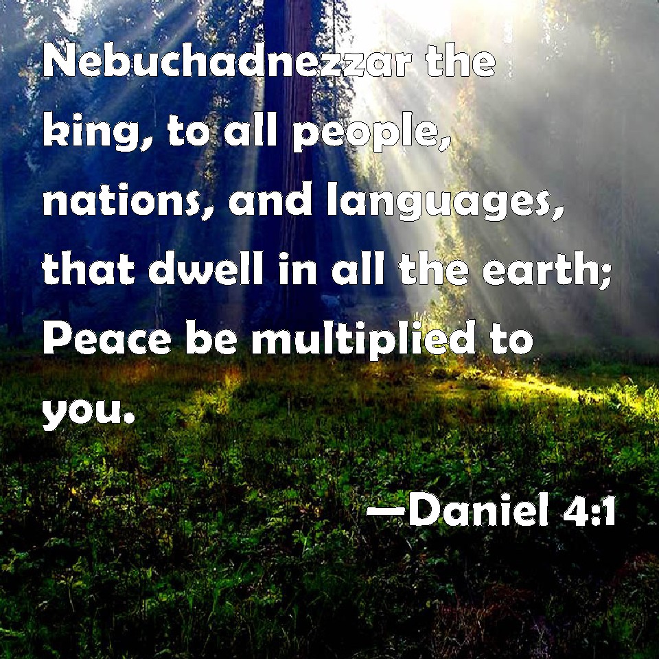Choose a Background Daniel 4:1 Nebuchadnezzar the king, to all people, nations, and languages, that dwell in all the earth; Peace be multiplied to you. KJV: Nebuchadnezzar the king, unto all people, nations, and languages, that dwell in all the earth; Peace be multiplied unto you. DRB: Nabuchodonosor the king, to all peoples, nations, and tongues, that dwell in all the earth, peace be multiplied unto you. DBT: Nebuchadnezzar the king unto all the peoples, nations, and languages, that dwell in all the earth: Peace be multiplied unto you. ERV: Nebuchadnezzar the king, unto all the peoples, nations, and languages, that dwell in all the earth; peace be multiplied unto you. WBT: Nebuchadnezzar the king, to all people, nations, and languages, that dwell in all the earth; Peace be multiplied to you. WEB: Nebuchadnezzar the king, to all the peoples, nations, and languages, who dwell in all the earth: Peace be multiplied to you. YLT: 'Nebuchadnezzar the king to all peoples, nations, and languages, who are dwelling in all the earth: Your peace be great!Links Daniel 4:1 NIV • Daniel 4:1 NLT • Daniel 4:1 ESV • Daniel 4:1 NASB • Daniel 4:1 KJV • Daniel 4:1 Interlinear • Daniel 4:1 Commentaries • Daniel 4:1 Parallel Texts • Daniel 4:1 Bible Apps • Daniel 4:1 Parallel • Bible Hub |