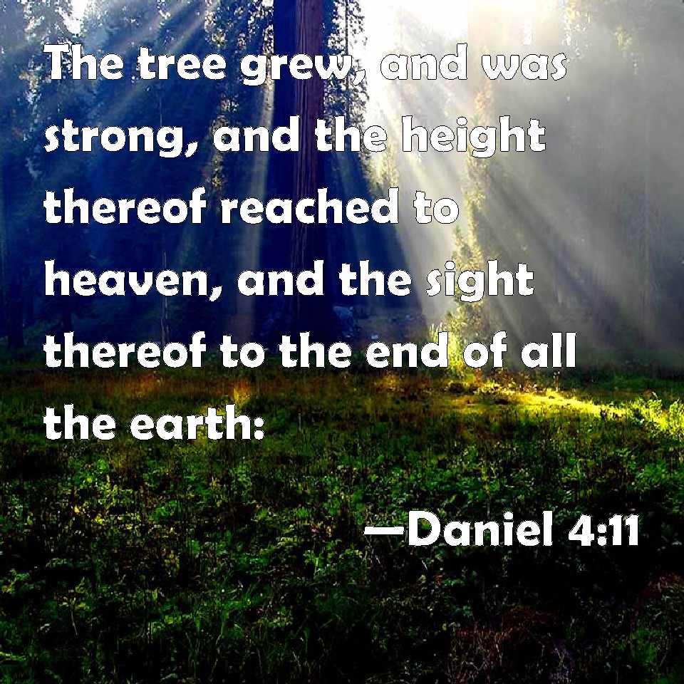 Choose a Background Daniel 4:11 The tree grew, and was strong, and the height thereof reached to heaven, and the sight thereof to the end of all the earth: KJV: The tree grew, and was strong, and the height thereof reached unto heaven, and the sight thereof to the end of all the earth: DRB: The tree was great, and strong: and the height thereof reached unto heaven: the sight thereof was even to the ends of all the earth. DBT: The tree grew, and was strong, and its height reached unto the heavens, and the sight thereof to the end of all the earth. ERV: The tree grew, and was strong, and the height thereof reached unto heaven, and the sight thereof to the end of all the earth. WBT: The tree grew, and was strong, and its hight reached to heaven, and the sight of it to the end of all the earth: WEB: The tree grew, and was strong, and its height reached to the sky, and its sight to the end of all the earth. YLT: become great hath the tree, yea, strong, and its height doth reach to the heavens, and its vision to the end of the whole land;Links Daniel 4:11 NIV • Daniel 4:11 NLT • Daniel 4:11 ESV • Daniel 4:11 NASB • Daniel 4:11 KJV • Daniel 4:11 Interlinear • Daniel 4:11 Commentaries • Daniel 4:11 Parallel Texts • Daniel 4:11 Bible Apps • Daniel 4:11 Parallel • Bible Hub |