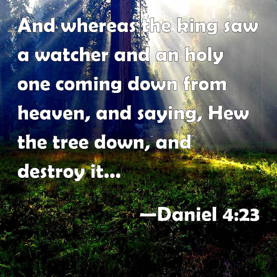 Choose a Background Daniel 4:23 And whereas the king saw a watcher and an holy one coming down from heaven, and saying, Hew the tree down, and destroy it; yet leave the stump of the roots thereof in the earth, even with a band of iron and brass, in the tender grass of the field; and let it be wet with the dew of heaven, and let his portion be with the beasts of the field, till seven times pass over him; KJV: And whereas the king saw a watcher and an holy one coming down from heaven, and saying, Hew the tree down, and destroy it; yet leave the stump of the roots thereof in the earth, even with a band of iron and brass, in the tender grass of the field; and let it be wet with the dew of heaven, and let his portion be with the beasts of the field, till seven times pass over him; DRB: And whereas the king saw a watcher, and a holy one come down from heaven, and say: Cut down the tree and destroy it, but leave the stump of the roots thereof in the earth, and let it be bound with iron and brass among the grass without, and let it be sprinkled with the dew of heaven, and let his feeding be with the wild beasts, till seven times pass over him. DBT: And whereas the king saw a watcher and a holy one coming down from the heavens, and saying, Hew the tree down, and destroy it; nevertheless leave the stump of its roots in the earth, even with a band of iron and brass, in the tender grass of the field; and let it be bathed with the dew of heaven, and let his portion be with the beasts of the field, till seven times pass over him: ERV: And whereas the king saw a watcher and an holy one coming down from heaven, and saying, Hew down the tree, and destroy it; nevertheless leave the stump of the roots thereof in the earth, even with a band of iron and brass, in the tender grass of the field; and let it be wet with the dew of heaven, and let his portion be with the beasts of the field, till seven times pass over him; WBT: And whereas the king saw a watcher and a holy one coming down from heaven, and saying, Hew the tree down, and destroy it; yet leave the stump of its roots in the earth, even with a band of iron and brass, in the tender grass of the field; and let it be wet with the dew of heaven, and let its portion be with the beasts of the field, till seven times shall pass over him; WEB: Whereas the king saw a watcher and a holy one coming down from the sky, and saying, Cut down the tree, and destroy it; nevertheless leave the stump of its roots in the earth, even with a band of iron and brass, in the tender grass of the field, and let it be wet with the dew of the sky: and let his portion be with the animals of the field, until seven times pass over him; YLT: and that which the king hath seen — a sifter, even a holy one, coming down from the heavens, and he hath said, Cut down the tree, and destroy it; but the stump of its roots leave in the earth, even with a band of iron and brass, in the tender grass of the field, and with the dew of the heavens it is wet, and with the beast of the field is his portion, till that seven times pass over him.Links Daniel 4:23 NIV • Daniel 4:23 NLT • Daniel 4:23 ESV • Daniel 4:23 NASB • Daniel 4:23 KJV • Daniel 4:23 Interlinear • Daniel 4:23 Commentaries • Daniel 4:23 Parallel Texts • Daniel 4:23 Bible Apps • Daniel 4:23 Parallel • Bible Hub |