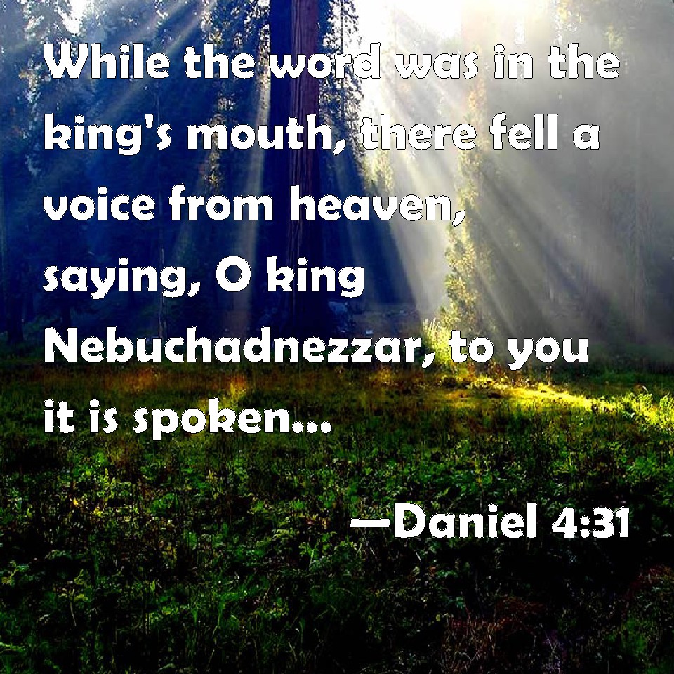 Choose a Background Daniel 4:31 While the word was in the king's mouth, there fell a voice from heaven, saying, O king Nebuchadnezzar, to you it is spoken; The kingdom is departed from you. KJV: While the word was in the king's mouth, there fell a voice from heaven, saying, O king Nebuchadnezzar, to thee it is spoken; The kingdom is departed from thee. DRB: And while the word was yet in the king's mouth, a voice came down from heaven: To thee, O king Nabuchodonosor, it is said: Thy kingdom shall pass from thee, DBT: While the word was in the king's mouth, there fell a voice from the heavens: King Nebuchadnezzar, to thee it is spoken: The kingdom is departed from thee; ERV: While the word was in the king's mouth, there fell a voice from heaven, saying, O king Nebuchadnezzar, to thee it is spoken: the kingdom is departed from thee. WBT: While the word was in the king's mouth, there fell a voice from heaven, saying, O king Nebuchadnezzar, to thee it is spoken; The kingdom hath departed from thee. WEB: While the word was in the king's mouth, there fell a voice from the sky, [saying], O king Nebuchadnezzar, to you it is spoken: The kingdom has departed from you: YLT: While the word is in the king's mouth a voice from the heavens hath fallen: To thee they are saying: O Nebuchadnezzar the king, the kingdom hath passed from thee,Links Daniel 4:31 NIV • Daniel 4:31 NLT • Daniel 4:31 ESV • Daniel 4:31 NASB • Daniel 4:31 KJV • Daniel 4:31 Interlinear • Daniel 4:31 Commentaries • Daniel 4:31 Parallel Texts • Daniel 4:31 Bible Apps • Daniel 4:31 Parallel • Bible Hub |