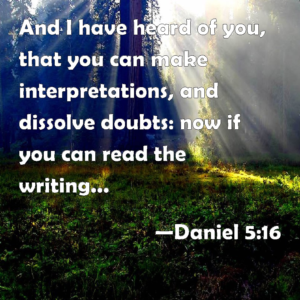 Choose a Background Daniel 5:16 And I have heard of you, that you can make interpretations, and dissolve doubts: now if you can read the writing, and make known to me the interpretation thereof, you shall be clothed with scarlet, and have a chain of gold about your neck, and shall be the third ruler in the kingdom. KJV: And I have heard of thee, that thou canst make interpretations, and dissolve doubts: now if thou canst read the writing, and make known to me the interpretation thereof, thou shalt be clothed with scarlet, and have a chain of gold about thy neck, and shalt be the third ruler in the kingdom. DRB: But I have heard of thee, that thou canst interpret obscure things, and resolve difficult things: now if thou art able to read the writing, and to shew me the interpretation thereof, thou shalt be clothed with purple, and shalt have a chain of gold about thy neck, and shalt be the third prince in my kingdom. DBT: But I have heard of thee, that thou canst give interpretations, and solve problems. Now if thou canst read the writing, and make known to me the interpretation thereof, thou shalt be clothed with purple, and have a chain of gold about thy neck, and shalt be the third ruler in the kingdom. ERV: But I have heard of thee, that thou canst give interpretations, and dissolve doubts: now if thou canst read the writing, and make known to me the interpretation thereof, thou shalt be clothed with purple, and have a chain of gold about thy neck, and shalt be the third ruler in the kingdom. WBT: And I have heard of thee, that thou canst make interpretations, and dissolve doubts: now if thou canst read the writing, and make known to me the interpretation of it, thou shalt be clothed with scarlet, and have a chain of gold about thy neck, and shalt be the third ruler in the kingdom. WEB: But I have heard of you, that you can give interpretations, and dissolve doubts; now if you can read the writing, and make known to me its interpretation, you shall be clothed with purple, and have a chain of gold about your neck, and shall be the third ruler in the kingdom. YLT: and I — I have heard of thee, that thou art able to give interpretations, and to loose knots: now, lo — thou art able to read the writing, and its interpretation to cause me to know — purple thou dost put on, and a bracelet of gold is on thy neck, and third in the kingdom thou dost rule.'Links Daniel 5:16 NIV • Daniel 5:16 NLT • Daniel 5:16 ESV • Daniel 5:16 NASB • Daniel 5:16 KJV • Daniel 5:16 Interlinear • Daniel 5:16 Commentaries • Daniel 5:16 Parallel Texts • Daniel 5:16 Bible Apps • Daniel 5:16 Parallel • Bible Hub |