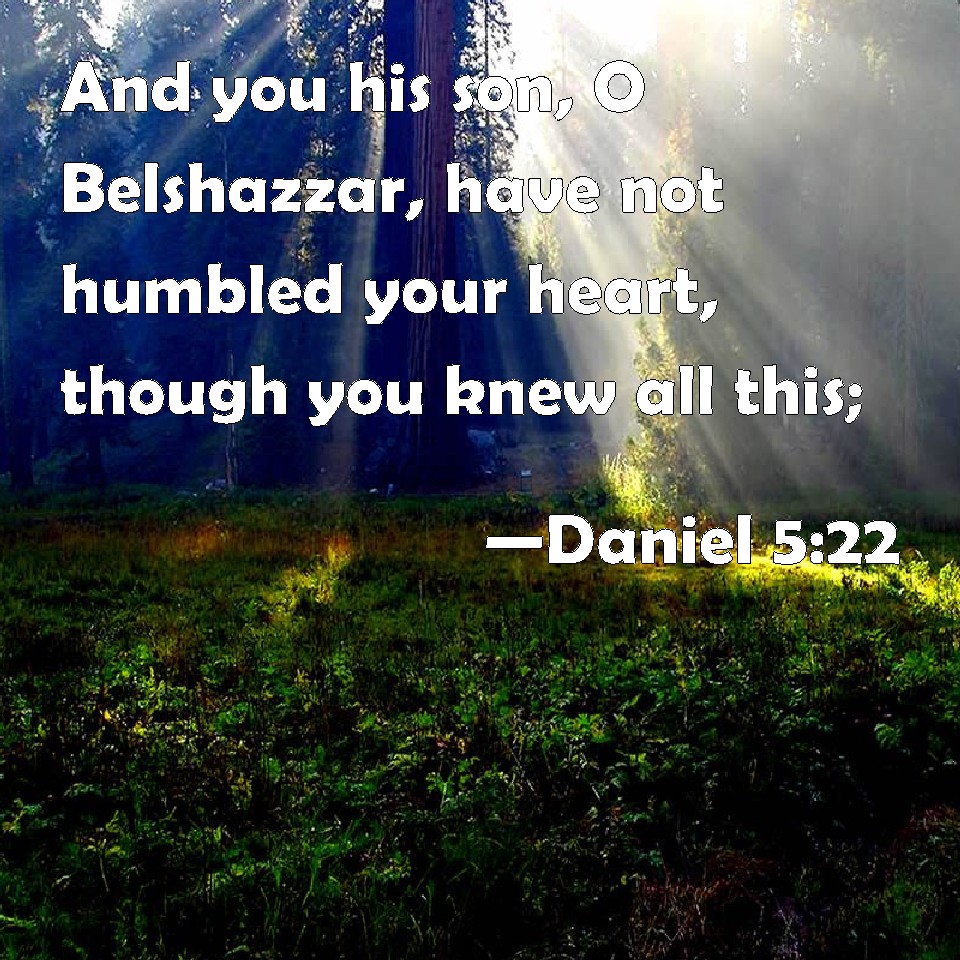 Choose a Background Daniel 5:22 And you his son, O Belshazzar, have not humbled your heart, though you knew all this; KJV: And thou his son, O Belshazzar, hast not humbled thine heart, though thou knewest all this; DRB: Thou also his son, O Baltasar, hast not humbled thy heart, whereas thou knewest all these things: DBT: And thou, Belshazzar, his son, hast not humbled thy heart, although thou knewest all this; ERV: And thou his son, O Belshazzar, hast not humbled thine heart, though thou knewest all this; WBT: And thou his son, O Belshazzar, hast not humbled thy heart, though thou knewest all this; WEB: You, his son, Belshazzar, have not humbled your heart, though you knew all this, YLT: 'And thou, his son, Belshazzar, hast not humbled thy heart, though all this thou hast known;Links Daniel 5:22 NIV • Daniel 5:22 NLT • Daniel 5:22 ESV • Daniel 5:22 NASB • Daniel 5:22 KJV • Daniel 5:22 Interlinear • Daniel 5:22 Commentaries • Daniel 5:22 Parallel Texts • Daniel 5:22 Bible Apps • Daniel 5:22 Parallel • Bible Hub |