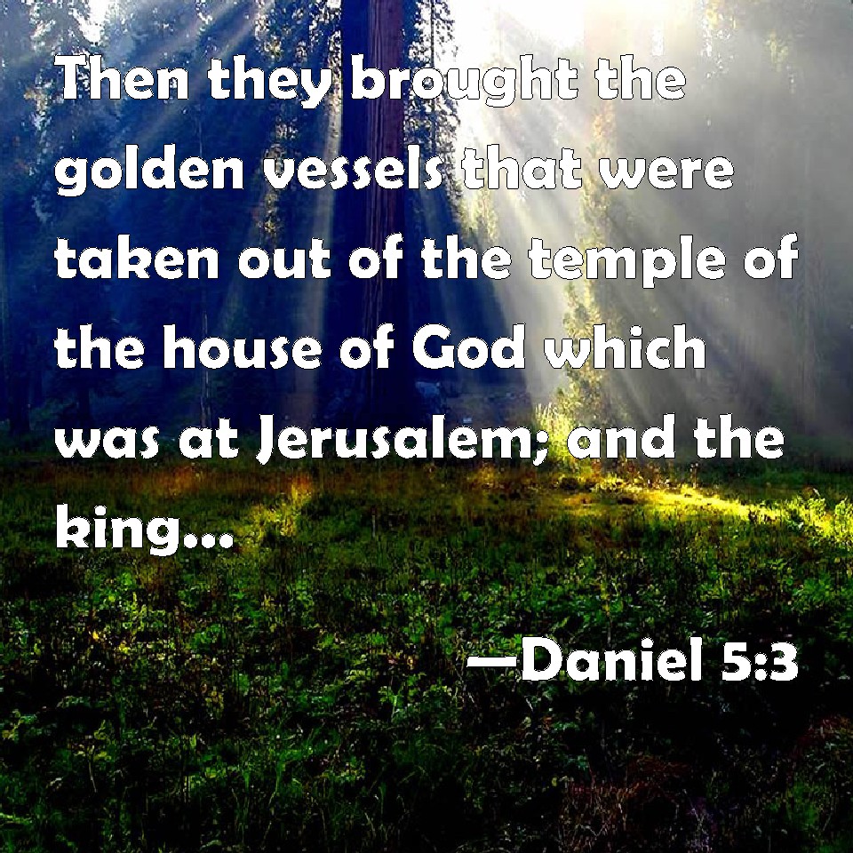 Choose a Background Daniel 5:3 Then they brought the golden vessels that were taken out of the temple of the house of God which was at Jerusalem; and the king, and his princes, his wives, and his concubines, drank in them. KJV: Then they brought the golden vessels that were taken out of the temple of the house of God which was at Jerusalem; and the king, and his princes, his wives, and his concubines, drank in them. DRB: Then were the golden and silver vessels brought, which he had brought away out of the temple that was in Jerusalem: and the king and his nobles, his wives and his concubines, drank in them. DBT: Then they brought the golden vessels that were taken out of the temple of the house of God which was at Jerusalem; and the king and his nobles, his wives and his concubines, drank in them. ERV: Then they brought the golden vessels that were taken out of the temple of the house of God which was at Jerusalem; and the king and his lords, his wives and his concubines, drank in them. WBT: Then they brought the golden vessels that were taken out of the temple of the house of God which was at Jerusalem; and the king, and his princes, his wives, and his concubines, drank in them. WEB: Then they brought the golden vessels that were taken out of the temple of the house of God which was at Jerusalem; and the king and his lords, his wives and his concubines, drank from them. YLT: Then they have brought in the vessels of gold that had been taken out of the temple of the house of God that is in Jerusalem, and drunk with them have the king and his great men, his wives and his concubines;Links Daniel 5:3 NIV • Daniel 5:3 NLT • Daniel 5:3 ESV • Daniel 5:3 NASB • Daniel 5:3 KJV • Daniel 5:3 Interlinear • Daniel 5:3 Commentaries • Daniel 5:3 Parallel Texts • Daniel 5:3 Bible Apps • Daniel 5:3 Parallel • Bible Hub |