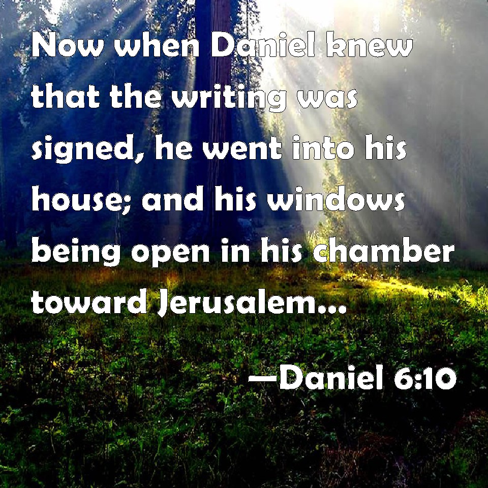 Choose a Background Daniel 6:10 Now when Daniel knew that the writing was signed, he went into his house; and his windows being open in his chamber toward Jerusalem, he kneeled on his knees three times a day, and prayed, and gave thanks before his God, as he did aforetime. KJV: Now when Daniel knew that the writing was signed, he went into his house; and his windows being open in his chamber toward Jerusalem, he kneeled upon his knees three times a day, and prayed, and gave thanks before his God, as he did aforetime. DRB: Now when Daniel knew this, that is to say, that the law was made, he went into his house: and opening the windows in his upper chamber towards Jerusalem, he knelt down three times a day, and adored, and gave thanks before his God, as he had been accustomed to do before. DBT: And when Daniel knew that the writing was signed, he went into his house; and, his windows being open in his upper chamber toward Jerusalem, he kneeled on his knees three times a day, and prayed and gave thanks before his God, as he did aforetime. ERV: And when Daniel knew that the writing was signed, he went into his house; (now his windows were open in his chamber toward Jerusalem;) and he kneeled upon his knees three times a day, and prayed, and gave thanks before his God, as he did aforetime. WBT: Now when Daniel knew that the writing was signed, he went into his house; and his windows being open in his chamber towards Jerusalem, he kneeled upon his knees three times a day, and prayed, and gave thanks before his God, as he did before. WEB: When Daniel knew that the writing was signed, he went into his house (now his windows were open in his room toward Jerusalem) and he kneeled on his knees three times a day, and prayed, and gave thanks before his God, as he did before. YLT: And Daniel, when he hath known that the writing is signed, hath gone up to his house, and the window being opened for him, in his upper chamber, over-against Jerusalem, three times in a day he is kneeling on his knees, and praying, and confessing before his God, because that he was doing it before this.Links Daniel 6:10 NIV • Daniel 6:10 NLT • Daniel 6:10 ESV • Daniel 6:10 NASB • Daniel 6:10 KJV • Daniel 6:10 Interlinear • Daniel 6:10 Commentaries • Daniel 6:10 Parallel Texts • Daniel 6:10 Bible Apps • Daniel 6:10 Parallel • Bible Hub |