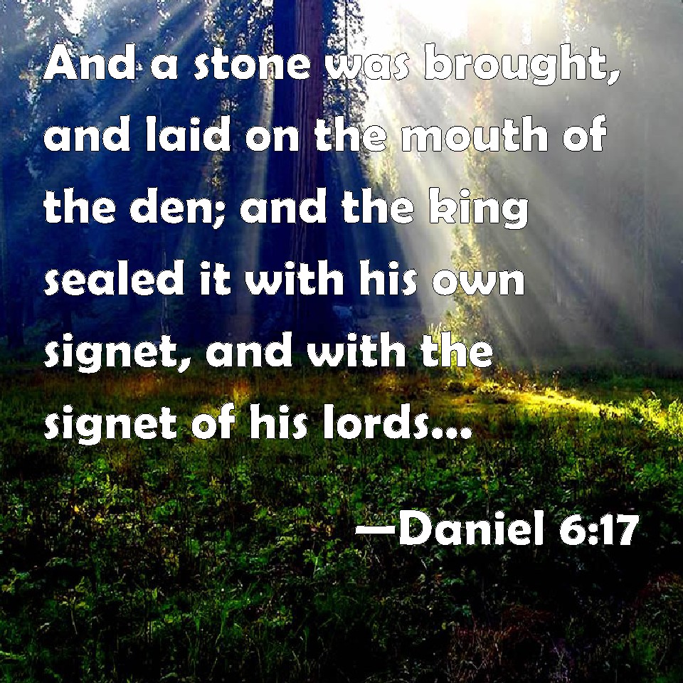 Choose a Background Daniel 6:17 And a stone was brought, and laid on the mouth of the den; and the king sealed it with his own signet, and with the signet of his lords; that the purpose might not be changed concerning Daniel. KJV: And a stone was brought, and laid upon the mouth of the den; and the king sealed it with his own signet, and with the signet of his lords; that the purpose might not be changed concerning Daniel. DRB: And a stone was brought, and laid upon the mouth of the den: which the king sealed with his own ring, and with the ring of his nobles, that nothing should be done against Daniel. DBT: And a stone was brought, and laid upon the mouth of the den; and the king sealed it with his own signet, and with the signet of his nobles, that the purpose might not be changed concerning Daniel. ERV: And a stone was brought, and laid upon the mouth of the den; and the king sealed it with his own signet, and with the signet of his lords; that nothing might be changed concerning Daniel. WBT: And a stone was brought, and laid upon the mouth of the den; and the king sealed it with his own signet, and with the signet of his lords; that the purpose might not be changed concerning Daniel. WEB: A stone was brought, and laid on the mouth of the den; and the king sealed it with his own signet, and with the signet of his lords; that nothing might be changed concerning Daniel. YLT: And a stone hath been brought and placed at the mouth of the den, and the king hath sealed it with his signet, and with the signet of his great men, that the purpose be not changed concerning Daniel.Links Daniel 6:17 NIV • Daniel 6:17 NLT • Daniel 6:17 ESV • Daniel 6:17 NASB • Daniel 6:17 KJV • Daniel 6:17 Interlinear • Daniel 6:17 Commentaries • Daniel 6:17 Parallel Texts • Daniel 6:17 Bible Apps • Daniel 6:17 Parallel • Bible Hub |