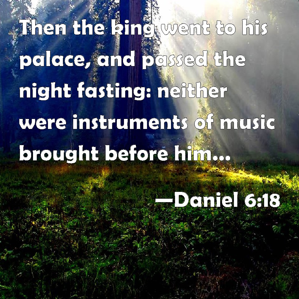 Choose a Background Daniel 6:18 Then the king went to his palace, and passed the night fasting: neither were instruments of music brought before him: and his sleep went from him. KJV: Then the king went to his palace, and passed the night fasting: neither were instruments of musick brought before him: and his sleep went from him. DRB: And the king went away to his house and laid himself down without taking supper, and meat was not set before him, and even sleep departed from him. DBT: Then the king went to his palace, and passed the night fasting; neither were concubines brought before him; and his sleep fled from him. ERV: Then the king went to his palace, and passed the night fasting: neither were instruments of music brought before him: and his sleep fled from him. WBT: Then the king went to his palace, and passed the night fasting: neither were instruments of music brought before him: and his sleep went from him. WEB: Then the king went to his palace, and passed the night fasting; neither were instruments of music brought before him: and his sleep fled from him. YLT: Then hath the king gone to his palace, and he hath passed the night fasting, and dahavan have not been brought up before him, and his sleep hath fled from off him.Links Daniel 6:18 NIV • Daniel 6:18 NLT • Daniel 6:18 ESV • Daniel 6:18 NASB • Daniel 6:18 KJV • Daniel 6:18 Interlinear • Daniel 6:18 Commentaries • Daniel 6:18 Parallel Texts • Daniel 6:18 Bible Apps • Daniel 6:18 Parallel • Bible Hub |