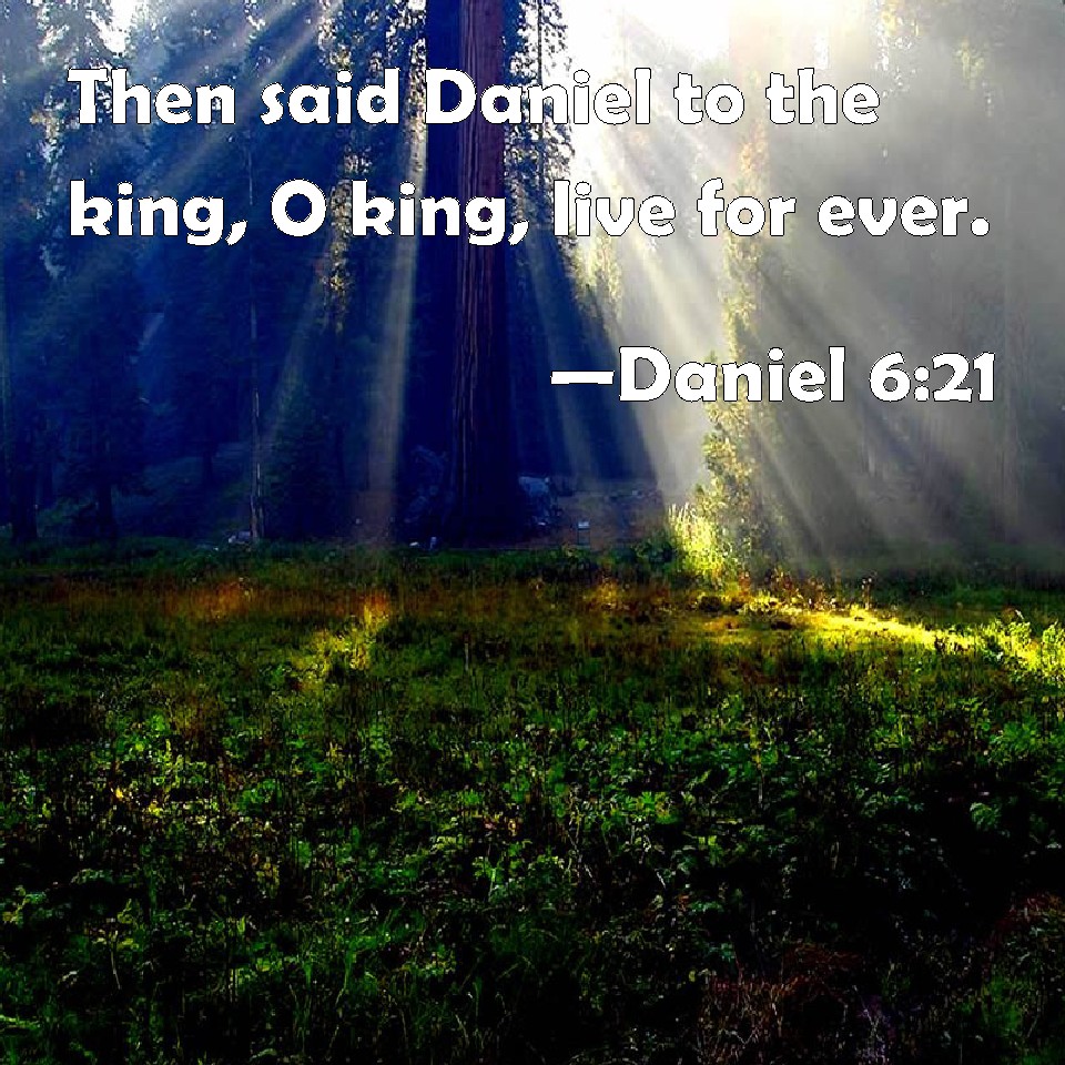 Choose a Background Daniel 6:21 Then said Daniel to the king, O king, live for ever. KJV: Then said Daniel unto the king, O king, live for ever. DRB: And Daniel answering the king, said: O king, live for ever: DBT: Then Daniel spoke unto the king, O king, live for ever! ERV: Then said Daniel unto the king, O king, live for ever. WBT: Then said Daniel to the king, O king, live for ever. WEB: Then Daniel said to the king, O king, live forever. YLT: Then Daniel hath spoken with the king: 'O king, to the ages live:Links Daniel 6:21 NIV • Daniel 6:21 NLT • Daniel 6:21 ESV • Daniel 6:21 NASB • Daniel 6:21 KJV • Daniel 6:21 Interlinear • Daniel 6:21 Commentaries • Daniel 6:21 Parallel Texts • Daniel 6:21 Bible Apps • Daniel 6:21 Parallel • Bible Hub |