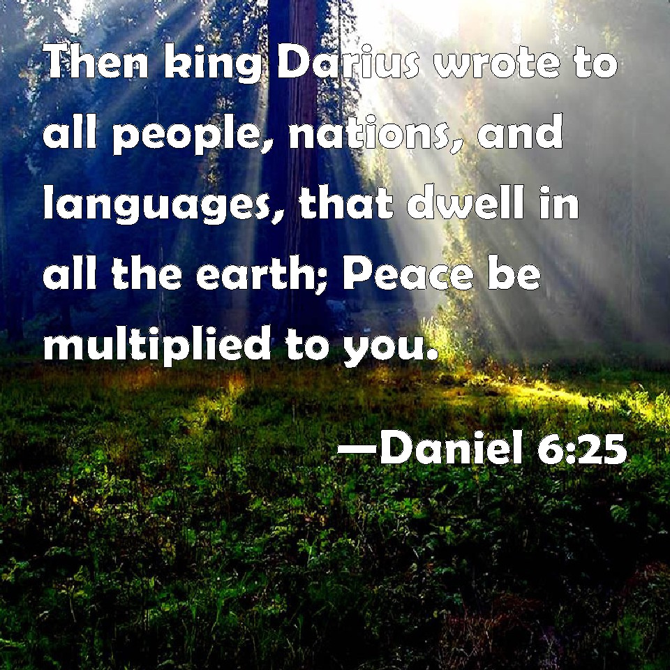Choose a Background Daniel 6:25 Then king Darius wrote to all people, nations, and languages, that dwell in all the earth; Peace be multiplied to you. KJV: Then king Darius wrote unto all people, nations, and languages, that dwell in all the earth; Peace be multiplied unto you. DRB: Then king Darius wrote to all people, tribes, and languages, dwelling in the whole earth: PEACE be multiplied unto you. DBT: Then king Darius wrote unto all peoples, nations, and languages, that dwell in all the earth: Peace be multiplied unto you. ERV: Then king Darius wrote unto all the peoples, nations, and languages, that dwell in all the earth; Peace be multiplied unto you. WBT: Then king Darius wrote to all people, nations, and languages, that dwell in all the earth; Peace be multiplied to you. WEB: Then king Darius wrote to all the peoples, nations, and languages, who dwell in all the earth: Peace be multiplied to you. YLT: Then Darius the king hath written to all the peoples, nations, and languages, who are dwelling in all the land: 'Your peace be great!Links Daniel 6:25 NIV • Daniel 6:25 NLT • Daniel 6:25 ESV • Daniel 6:25 NASB • Daniel 6:25 KJV • Daniel 6:25 Interlinear • Daniel 6:25 Commentaries • Daniel 6:25 Parallel Texts • Daniel 6:25 Bible Apps • Daniel 6:25 Parallel • Bible Hub |