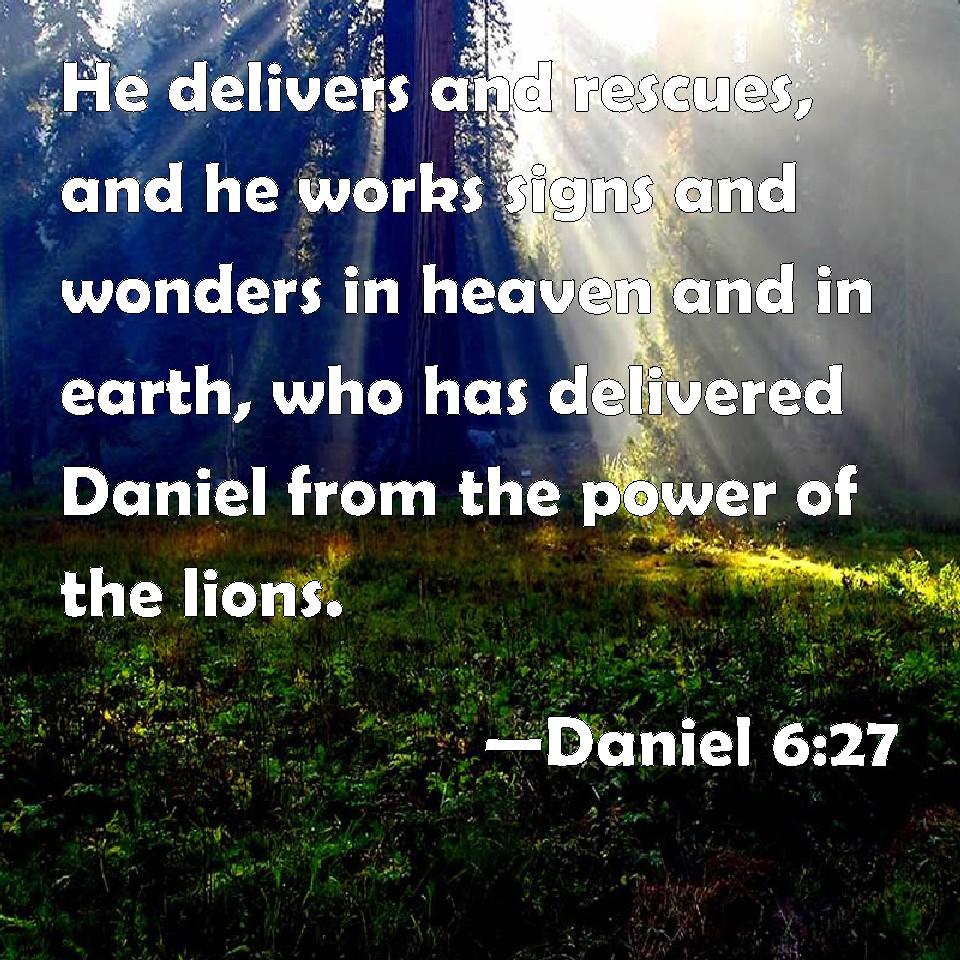 Choose a Background Daniel 6:27 He delivers and rescues, and he works signs and wonders in heaven and in earth, who has delivered Daniel from the power of the lions. KJV: He delivereth and rescueth, and he worketh signs and wonders in heaven and in earth, who hath delivered Daniel from the power of the lions. DRB: He is the deliverer, and saviour, doing signs and wonders in heaven, and in earth: who hath delivered Daniel out of the lions' den. DBT: He saveth and delivereth, and he worketh signs and wonders in the heavens and on the earth: who hath saved Daniel from the power of the lions. ERV: He delivereth and rescueth, and he worketh signs and wonders in heaven and in earth; who hath delivered Daniel from the power of the lions. WBT: He delivereth and rescueth, and he worketh signs and wonders in heaven and on earth, who hath delivered Daniel from the power of the lions. WEB: He delivers and rescues, and he works signs and wonders in heaven and in earth, who has delivered Daniel from the power of the lions. YLT: A deliverer, and rescuer, and doer of signs and wonders in the heavens and in earth is He who hath delivered Daniel from the paw of the lions.'Links Daniel 6:27 NIV • Daniel 6:27 NLT • Daniel 6:27 ESV • Daniel 6:27 NASB • Daniel 6:27 KJV • Daniel 6:27 Interlinear • Daniel 6:27 Commentaries • Daniel 6:27 Parallel Texts • Daniel 6:27 Bible Apps • Daniel 6:27 Parallel • Bible Hub |
