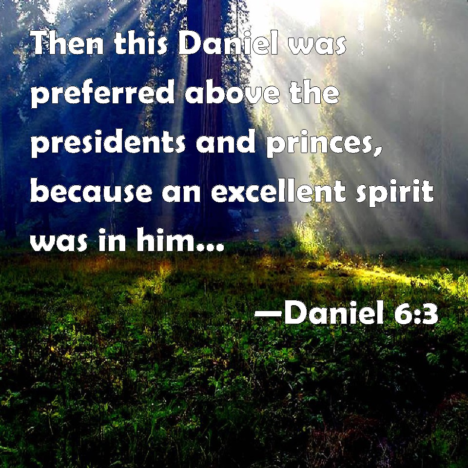 Daniel 6:3 Then this Daniel was preferred above the presidents and princes, because an excellent spirit was in him; and the king thought to set him over the whole realm.