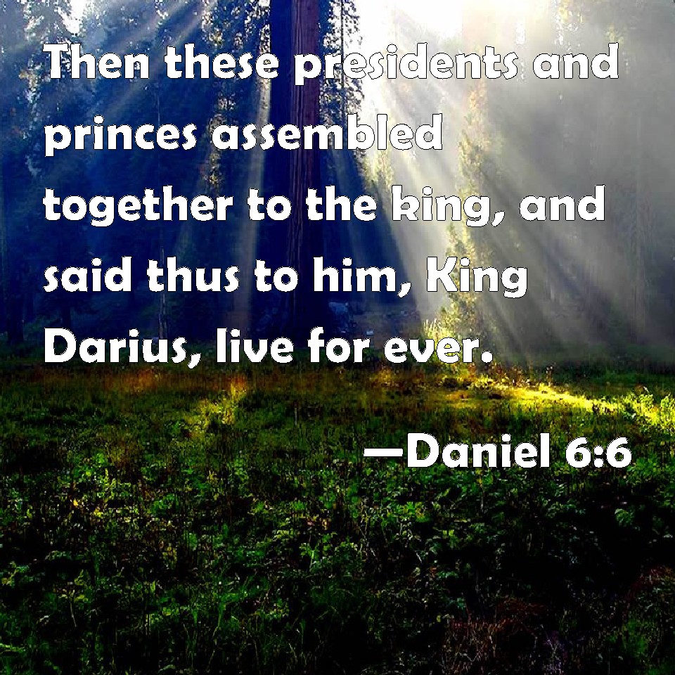 Choose a Background Daniel 6:6 Then these presidents and princes assembled together to the king, and said thus to him, King Darius, live for ever. KJV: Then these presidents and princes assembled together to the king, and said thus unto him, King Darius, live for ever. DRB: Then the princes, and the governors craftily suggested to the king, and spoke thus unto him: King Darius, live for ever: DBT: Then these presidents and satraps came in a body to the king, and said thus unto him: King Darius, live for ever! ERV: Then these presidents and satraps assembled together to the king, and said thus unto him, King Darius, live for ever. WBT: Then these presidents and princes assembled to the king, and said thus to him, King Darius, live for ever. WEB: Then these presidents and satraps assembled together to the king, and said thus to him, King Darius, live forever. YLT: Then these presidents and satraps have assembled near the king, and thus they are saying to him: 'O king Darius, to the ages live!Links Daniel 6:6 NIV • Daniel 6:6 NLT • Daniel 6:6 ESV • Daniel 6:6 NASB • Daniel 6:6 KJV • Daniel 6:6 Interlinear • Daniel 6:6 Commentaries • Daniel 6:6 Parallel Texts • Daniel 6:6 Bible Apps • Daniel 6:6 Parallel • Bible Hub |