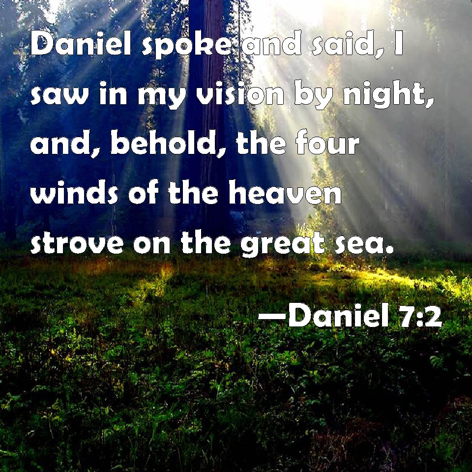 Choose a Background Daniel 7:2 Daniel spoke and said, I saw in my vision by night, and, behold, the four winds of the heaven strove on the great sea. KJV: Daniel spake and said, I saw in my vision by night, and, behold, the four winds of the heaven strove upon the great sea. DRB: I saw in my vision by night, and behold the four winds of the heaven strove upon the great sea. DBT: Daniel spoke and said, I saw in my vision by night, and behold, the four winds of the heavens broke forth upon the great sea. ERV: Daniel spake and said, I saw in my vision by night, and, behold, the four winds of the heaven brake forth upon the great sea. WBT: Daniel spoke and said, I saw in my vision by night, and behold, the four winds of heaven strove upon the great sea. WEB: Daniel spoke and said, I saw in my vision by night, and, behold, the four winds of the sky broke forth on the great sea. YLT: Answered hath Daniel and said, 'I was seeing in my vision by night, and lo, the four winds of the heavens are coming forth to the great sea;Links Daniel 7:2 NIV • Daniel 7:2 NLT • Daniel 7:2 ESV • Daniel 7:2 NASB • Daniel 7:2 KJV • Daniel 7:2 Interlinear • Daniel 7:2 Commentaries • Daniel 7:2 Parallel Texts • Daniel 7:2 Bible Apps • Daniel 7:2 Parallel • Bible Hub |