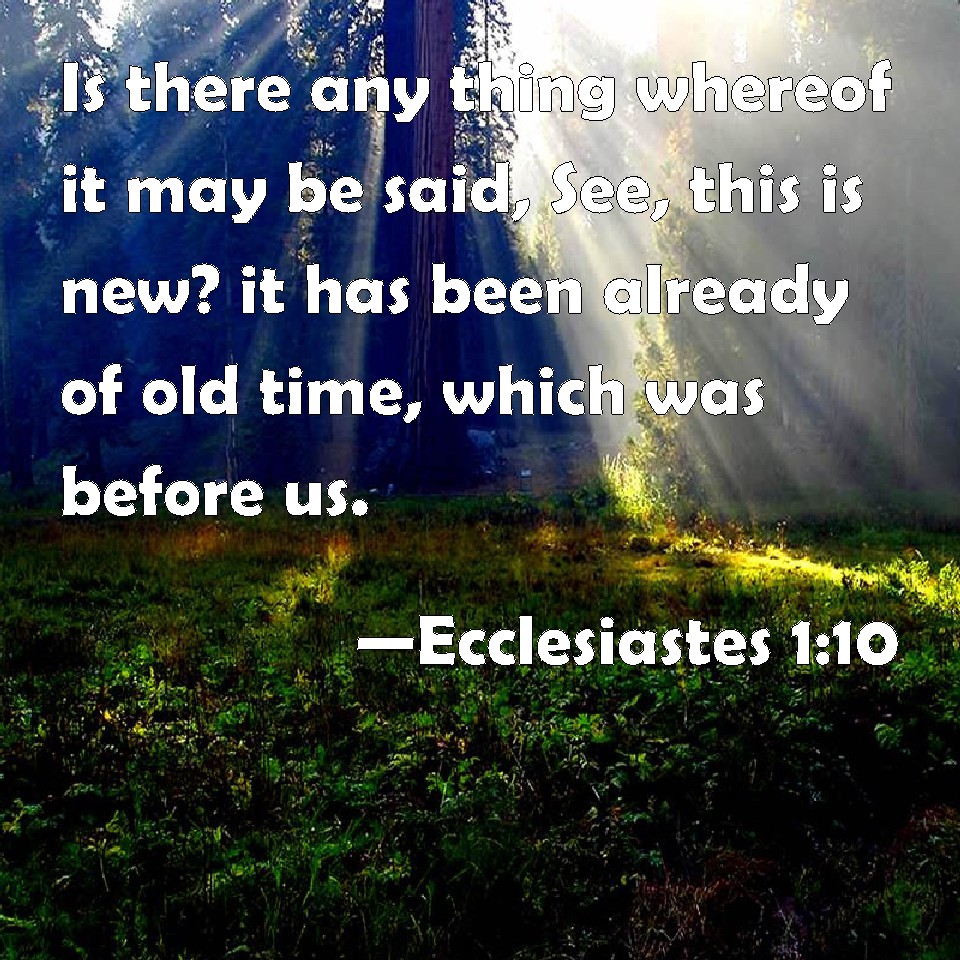 Choose a Background Ecclesiastes 1:10 Is there any thing whereof it may be said, See, this is new? it has been already of old time, which was before us. KJV: Is there any thing whereof it may be said, See, this is new? it hath been already of old time, which was before us. DRB: Nothing under the sun is new, neither is any man able to say: Behold this is new: for it hath already gone before in the ages that were before us. DBT: Is there a thing whereof it may be said, See, this is new? It hath been already in the ages which were before us. ERV: Is there a thing whereof men say, See, this is new? it hath been already, in the ages which were before us. WBT: Is there any thing of which it may be said, See, this is new? it hath been already of old time, which was before us. WEB: Is there a thing of which it may be said, "Behold, this is new?" It has been long ago, in the ages which were before us. YLT: There is a thing of which one saith: 'See this, it is new!' already it hath been in the ages that were before us!Links Ecclesiastes 1:10 NIV • Ecclesiastes 1:10 NLT • Ecclesiastes 1:10 ESV • Ecclesiastes 1:10 NASB • Ecclesiastes 1:10 KJV • Ecclesiastes 1:10 Interlinear • Ecclesiastes 1:10 Commentaries • Ecclesiastes 1:10 Parallel Texts • Ecclesiastes 1:10 Bible Apps • Ecclesiastes 1:10 Parallel • Bible Hub |