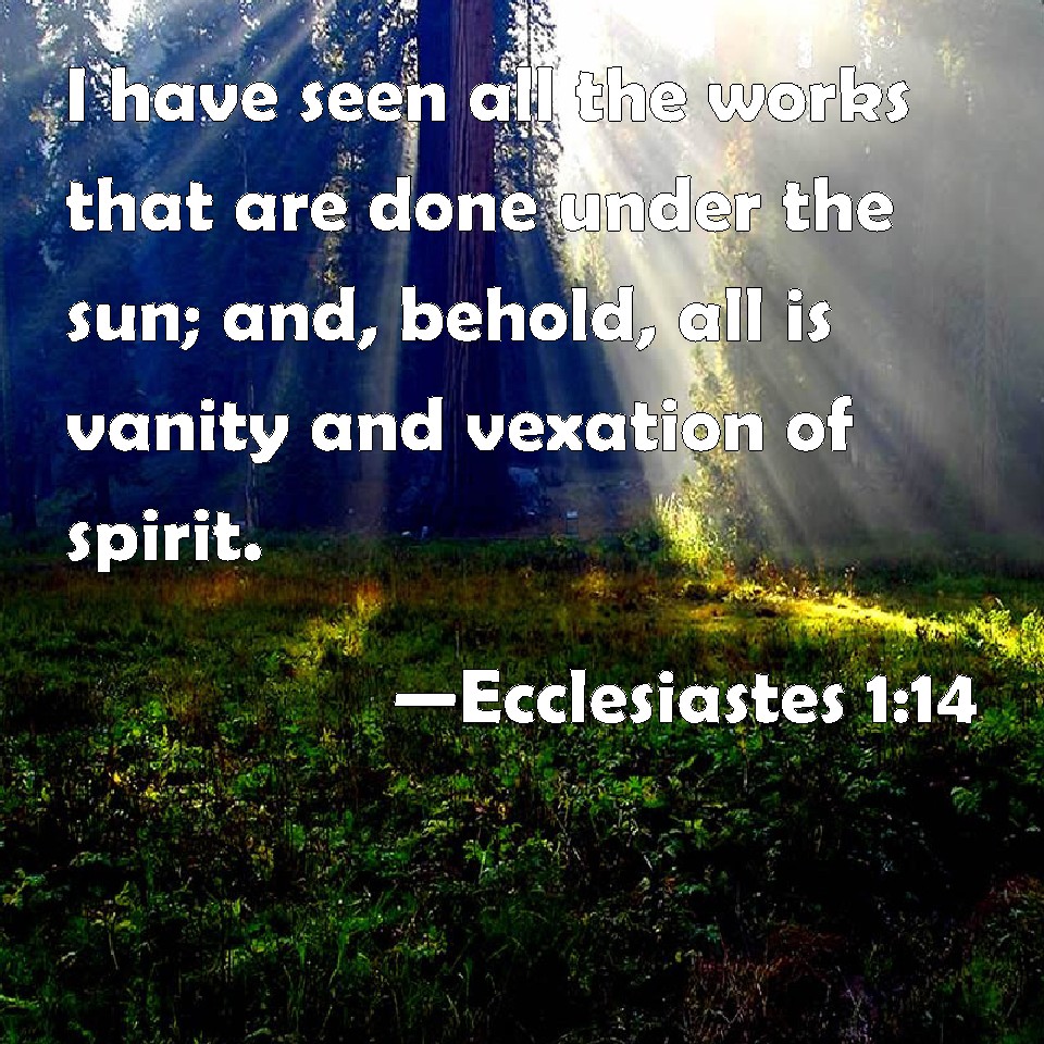Choose a Background Ecclesiastes 1:14 I have seen all the works that are done under the sun; and, behold, all is vanity and vexation of spirit. KJV: I have seen all the works that are done under the sun; and, behold, all is vanity and vexation of spirit. DRB: I have seen all things that are done under the sun, and behold all is vanity, and vexation of spirit. DBT: I have seen all the works that are done under the sun, and behold, all is vanity and pursuit of the wind. ERV: I have seen all the works that are done under the sun; and, behold, all is vanity and a striving after wind. WBT: I have seen all the works that are done under the sun; and behold, all is vanity and vexation of spirit. WEB: I have seen all the works that are done under the sun; and behold, all is vanity and a chasing after wind. YLT: I have seen all the works that have been done under the sun, and lo, the whole is vanity and vexation of spirit!Links Ecclesiastes 1:14 NIV • Ecclesiastes 1:14 NLT • Ecclesiastes 1:14 ESV • Ecclesiastes 1:14 NASB • Ecclesiastes 1:14 KJV • Ecclesiastes 1:14 Interlinear • Ecclesiastes 1:14 Commentaries • Ecclesiastes 1:14 Parallel Texts • Ecclesiastes 1:14 Bible Apps • Ecclesiastes 1:14 Parallel • Bible Hub |