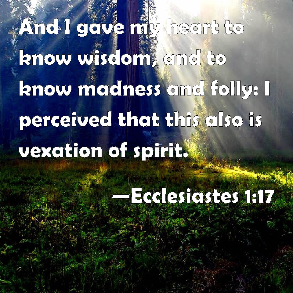 Choose a Background Ecclesiastes 1:17 And I gave my heart to know wisdom, and to know madness and folly: I perceived that this also is vexation of spirit. KJV: And I gave my heart to know wisdom, and to know madness and folly: I perceived that this also is vexation of spirit. DRB: And I have given my heart to know prudence, and learning, and errors, and folly: and I have perceived that in these also there was labour, and vexation of spirit, DBT: And I applied my heart to the knowledge of wisdom, and to the knowledge of madness and folly: I perceived that this also is a striving after the wind. ERV: And I applied my heart to know wisdom, and to know madness and folly: I perceived that this also was a striving after wind. WBT: And I gave my heart to know wisdom, and to know madness and folly: I perceived that this also is vexation of spirit. WEB: I applied my heart to know wisdom, and to know madness and folly. I perceived that this also was a chasing after wind. YLT: And I give my heart to know wisdom, and to know madness and folly: I have known that even this is vexation of spirit;Links Ecclesiastes 1:17 NIV • Ecclesiastes 1:17 NLT • Ecclesiastes 1:17 ESV • Ecclesiastes 1:17 NASB • Ecclesiastes 1:17 KJV • Ecclesiastes 1:17 Interlinear • Ecclesiastes 1:17 Commentaries • Ecclesiastes 1:17 Parallel Texts • Ecclesiastes 1:17 Bible Apps • Ecclesiastes 1:17 Parallel • Bible Hub |