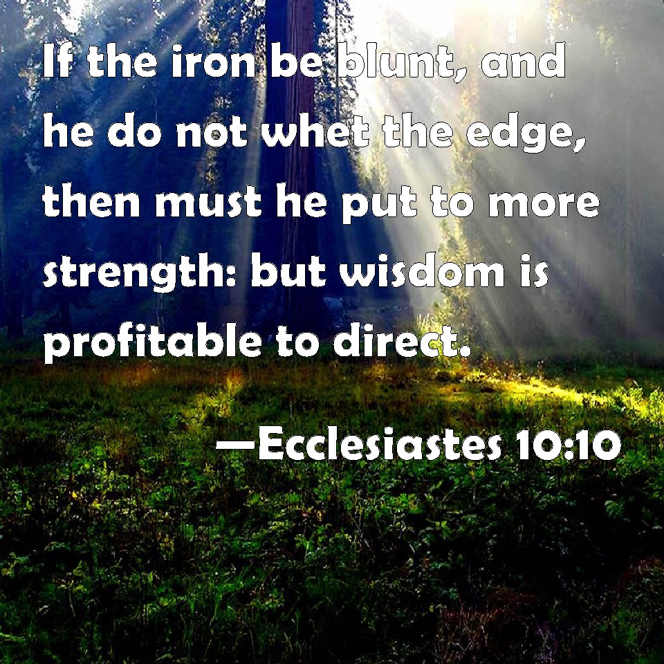 Choose a Background Ecclesiastes 10:10 If the iron be blunt, and he do not whet the edge, then must he put to more strength: but wisdom is profitable to direct. KJV: If the iron be blunt, and he do not whet the edge, then must he put to more strength: but wisdom is profitable to direct. DRB: If the iron be blunt, and be not as before, but be made blunt, with much labour it shall be sharpened: and after industry shall follow wisdom. DBT: If the iron be blunt, and one do not whet the edge, then must he apply more strength; but wisdom is profitable to give success. ERV: If the iron be blunt, and one do not whet the edge, then must he put to more strength: but wisdom is profitable to direct. WBT: If the iron is blunt, and he doth not whet the edge, then must he use more strength: but wisdom is profitable to direct. WEB: If the axe is blunt, and one doesn't sharpen the edge, then he must use more strength; but skill brings success. YLT: If the iron hath been blunt, And he the face hath not sharpened, Then doth he increase strength, And wisdom is advantageous to make right.Links Ecclesiastes 10:10 NIV • Ecclesiastes 10:10 NLT • Ecclesiastes 10:10 ESV • Ecclesiastes 10:10 NASB • Ecclesiastes 10:10 KJV • Ecclesiastes 10:10 Interlinear • Ecclesiastes 10:10 Commentaries • Ecclesiastes 10:10 Parallel Texts • Ecclesiastes 10:10 Bible Apps • Ecclesiastes 10:10 Parallel • Bible Hub |