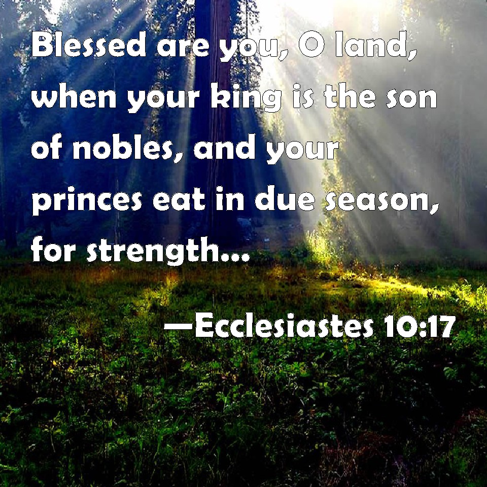 Choose a Background Ecclesiastes 10:17 Blessed are you, O land, when your king is the son of nobles, and your princes eat in due season, for strength, and not for drunkenness! KJV: Blessed art thou, O land, when thy king is the son of nobles, and thy princes eat in due season, for strength, and not for drunkenness! DRB: Blessed is the land, whose king is noble, and whose princes eat in due season for refreshment, and not for riotousness. DBT: Happy art thou, O land, when thy king is a son of nobles, and thy princes eat in due season, for strength, and not for drunkenness! ERV: Happy art thou, O land, when thy king is the son of nobles, and thy princes eat in due season, for strength, and not for drunkenness! WBT: Blessed art thou, O land, when thy king is the son of nobles, and thy princes eat in due season, for strength, and not for drunkenness! WEB: Happy are you, land, when your king is the son of nobles, and your princes eat in due season, for strength, and not for drunkenness! YLT: Happy art thou, O land, When thy king is a son of freemen, And thy princes do eat in due season, For might, and not for drunkenness.Links Ecclesiastes 10:17 NIV • Ecclesiastes 10:17 NLT • Ecclesiastes 10:17 ESV • Ecclesiastes 10:17 NASB • Ecclesiastes 10:17 KJV • Ecclesiastes 10:17 Interlinear • Ecclesiastes 10:17 Commentaries • Ecclesiastes 10:17 Parallel Texts • Ecclesiastes 10:17 Bible Apps • Ecclesiastes 10:17 Parallel • Bible Hub |