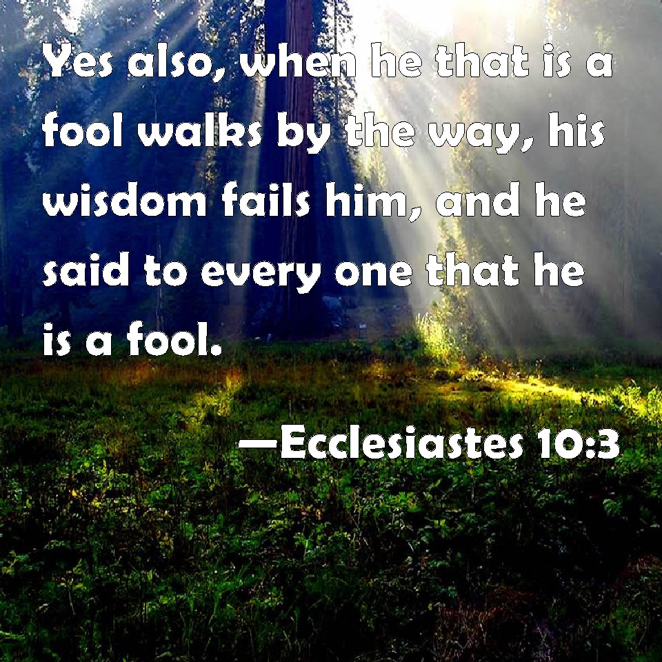 Choose a Background Ecclesiastes 10:3 Yes also, when he that is a fool walks by the way, his wisdom fails him, and he said to every one that he is a fool. KJV: Yea also, when he that is a fool walketh by the way, his wisdom faileth him, and he saith to every one that he is a fool. DRB: Yea, and the fool when he walketh in the way, whereas be himself is a fool, esteemeth all men fools. DBT: Yea also, when he that is a fool walketh by the way, his sense faileth him, and he saith to every one that he is a fool. ERV: Yea also, when the fool walketh by the way, his understanding faileth him, and he saith to every one that he is a fool. WBT: Also, when he that is a fool walketh by the way, his wisdom faileth him, and he saith to every one that he is a fool. WEB: Yes also, when the fool walks by the way, his understanding fails him, and he says to everyone that he is a fool. YLT: And also, when he that is a fool Is walking in the way, his heart is lacking, And he hath said to every one, 'He is a fool.'Links Ecclesiastes 10:3 NIV • Ecclesiastes 10:3 NLT • Ecclesiastes 10:3 ESV • Ecclesiastes 10:3 NASB • Ecclesiastes 10:3 KJV • Ecclesiastes 10:3 Interlinear • Ecclesiastes 10:3 Commentaries • Ecclesiastes 10:3 Parallel Texts • Ecclesiastes 10:3 Bible Apps • Ecclesiastes 10:3 Parallel • Bible Hub |